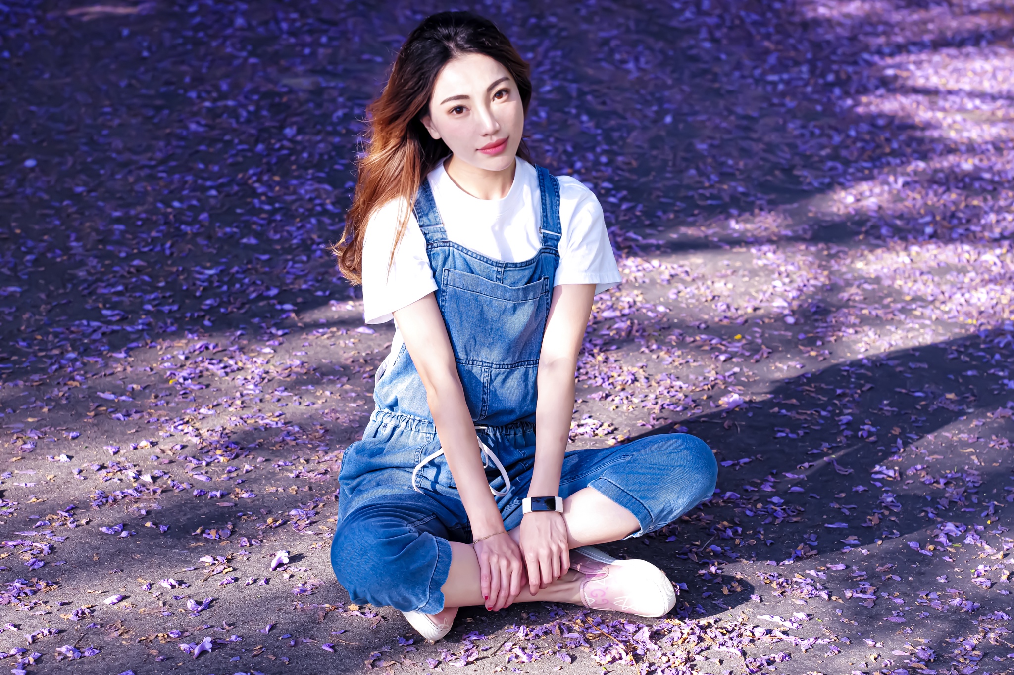 Painting of a young woman with long brown hair sitting cross-legged outdoors on a purple and gold ground.