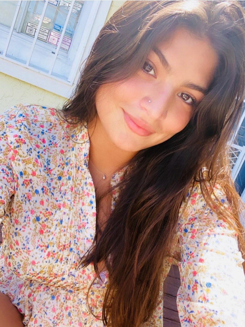 Colored pencil portrait of a young woman with long brown hair, wearing a floral shirt.