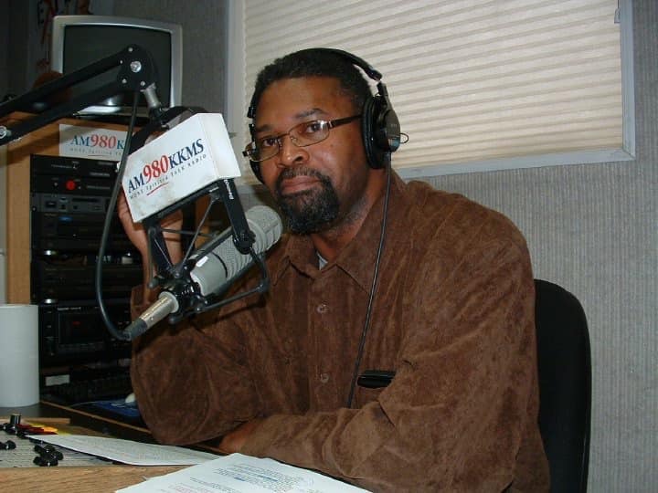 Colored pencil portrait of a man wearing glasses and headphones at a radio microphone.