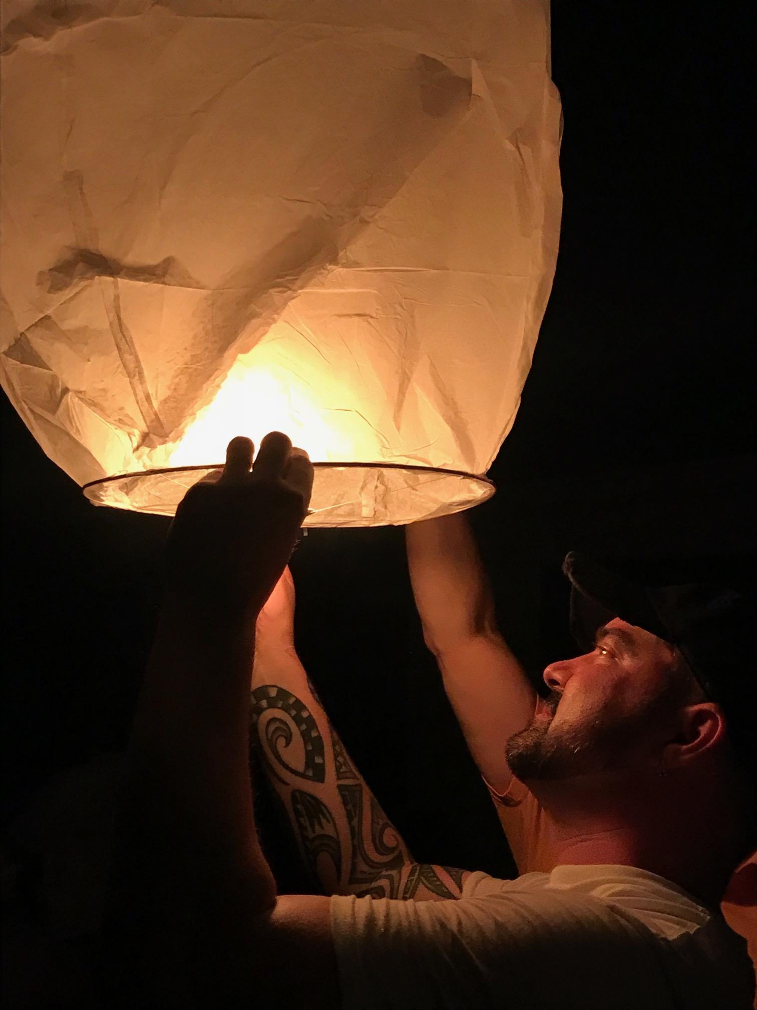 Painting of a man releasing a lighted sky lantern.
