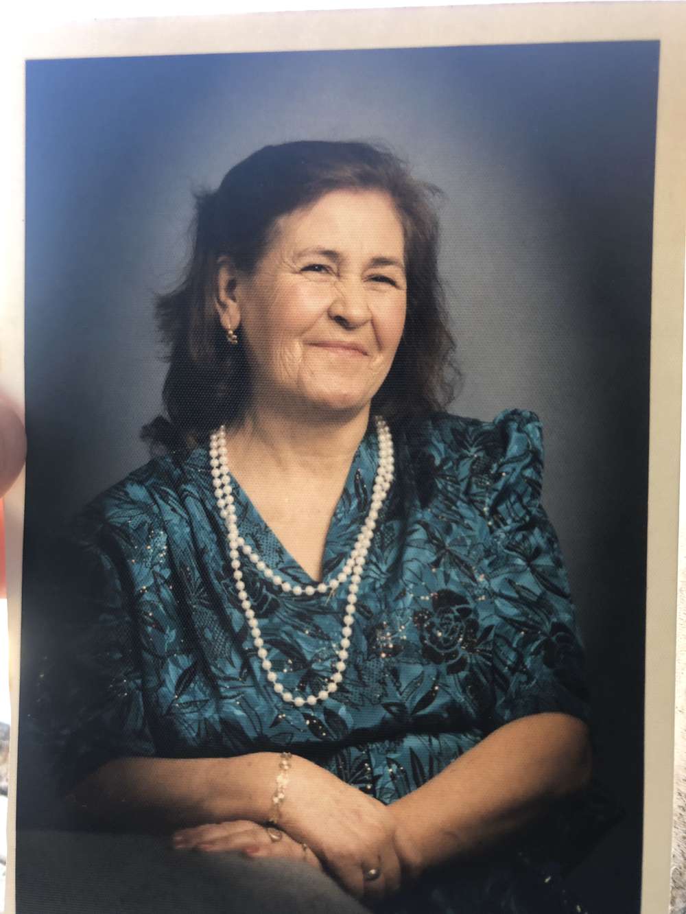 Oil portrait of a smiling older woman wearing a teal patterned dress and pearl necklace.