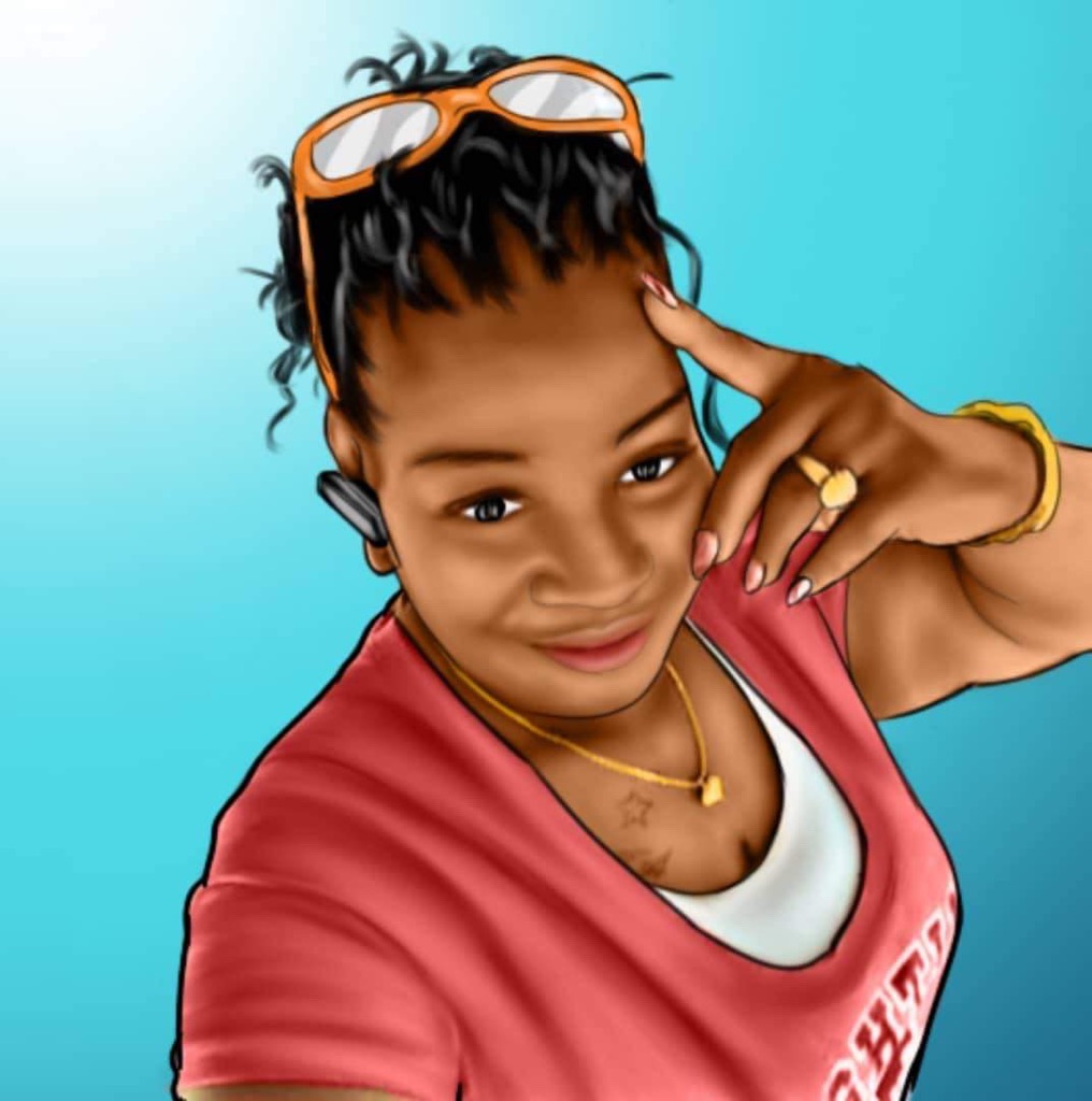 Painting of a smiling woman wearing sunglasses and an orange shirt at the beach.