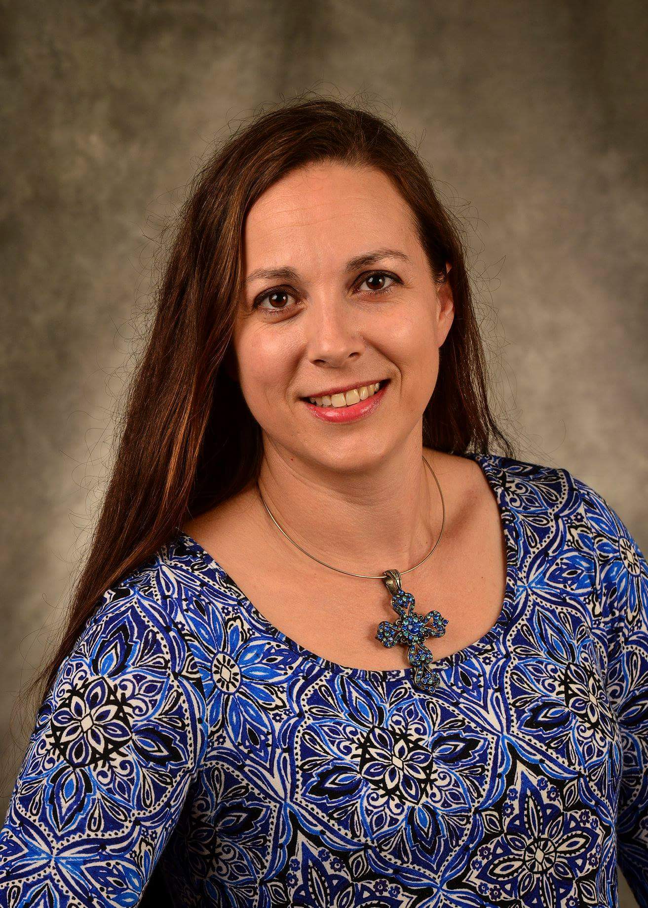 Portrait of a smiling woman with long brown hair, wearing a blue patterned top and silver cross necklace.
