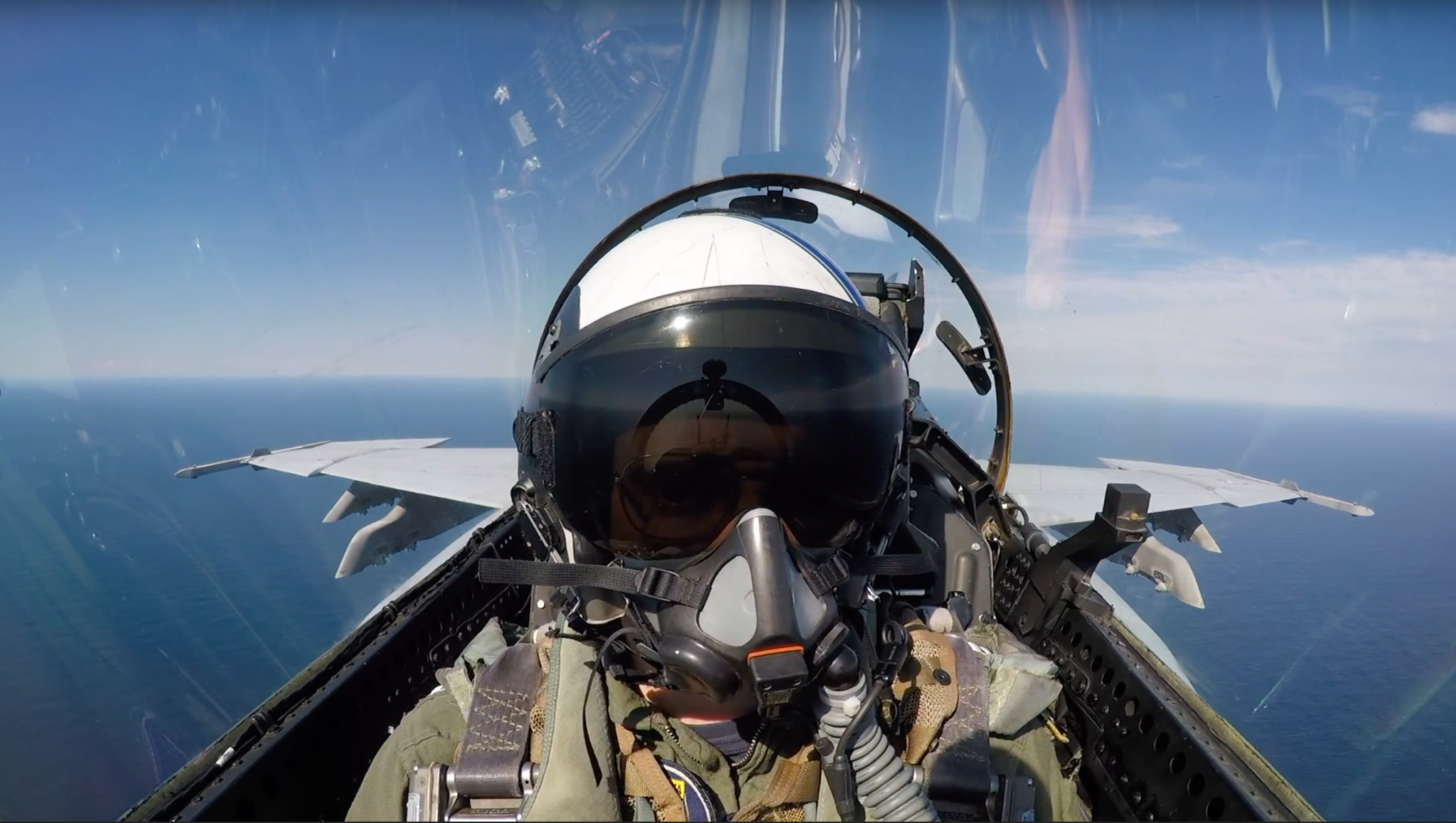 Fighter pilot in cockpit, aerial view.