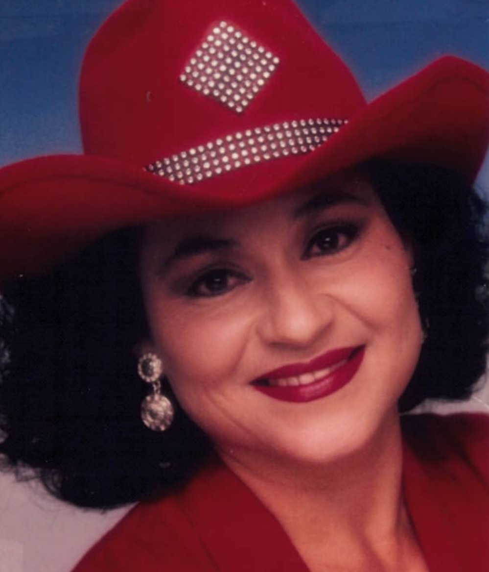 Portrait of a woman in a red cowboy hat, flanked by candles and small bells.