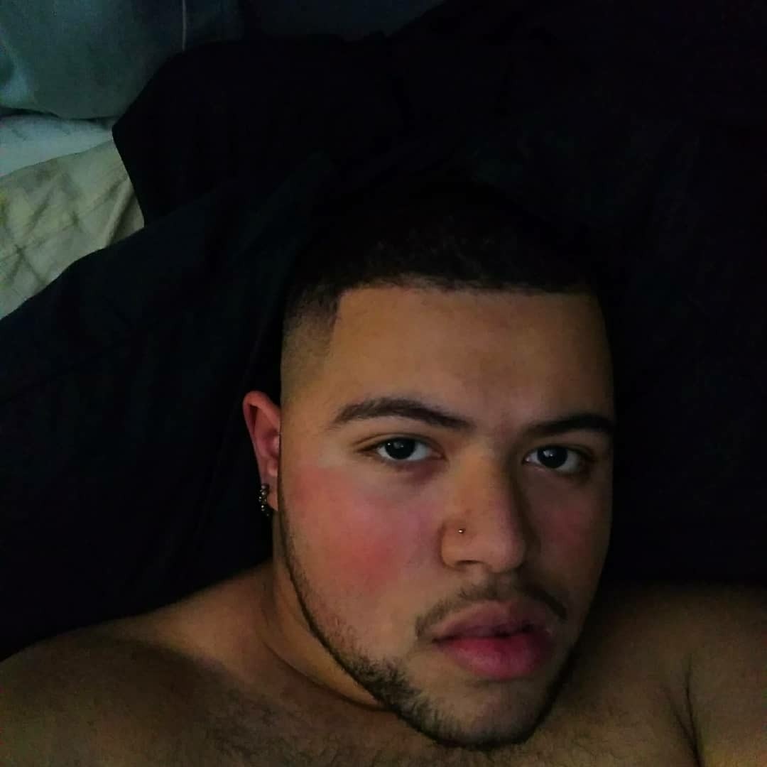 Painting of a man with short dark hair and a nose ring, against an abstract background of swirling orange and purple.
