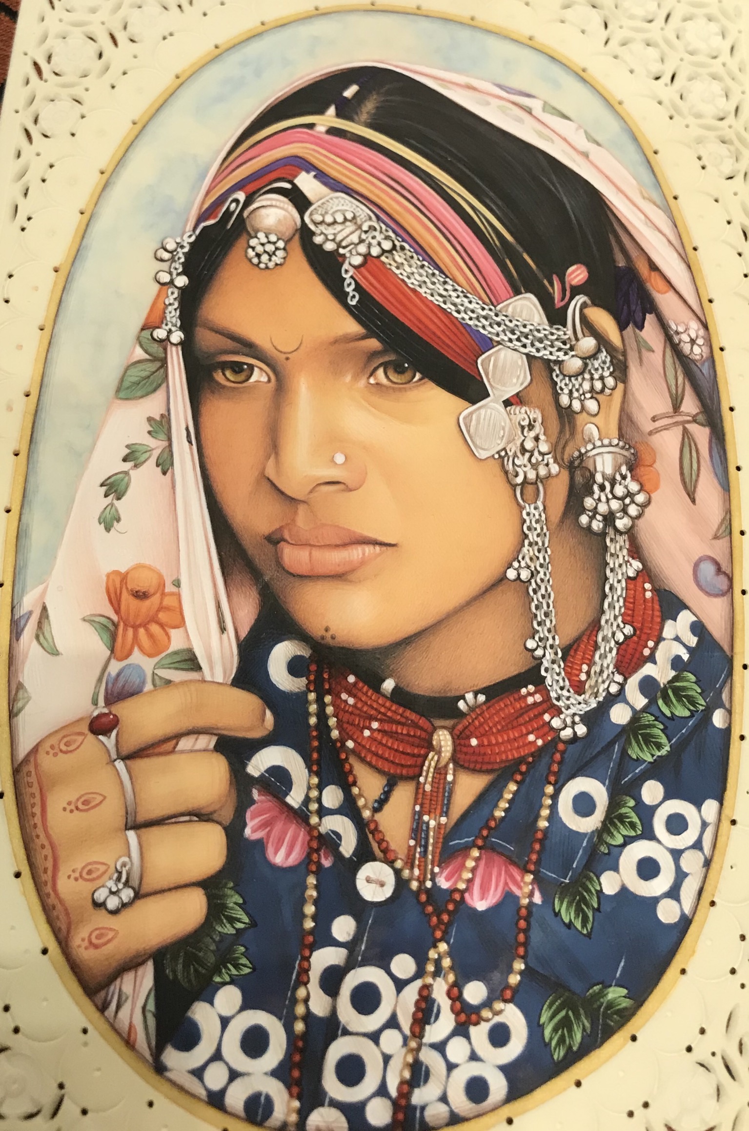 Framed portrait of a woman in traditional clothing and jewelry.