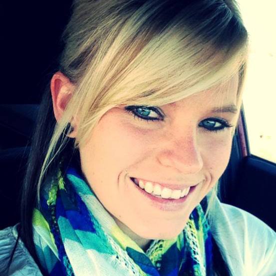 Portrait of a smiling blonde woman with blue eyes wearing a scarf.