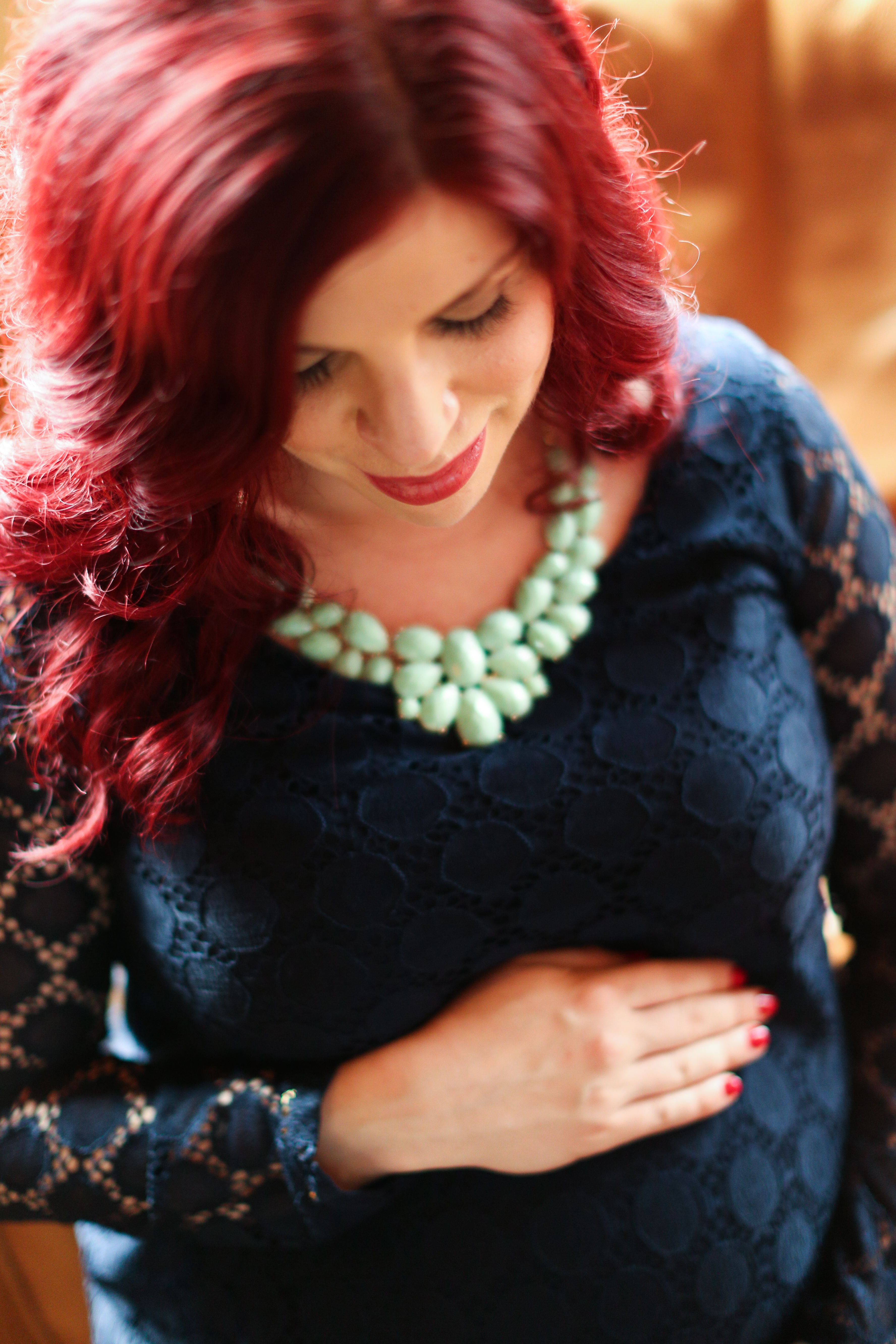 Painting of a pregnant woman with red hair wearing a blue dress and turquoise necklace, looking down at her belly.