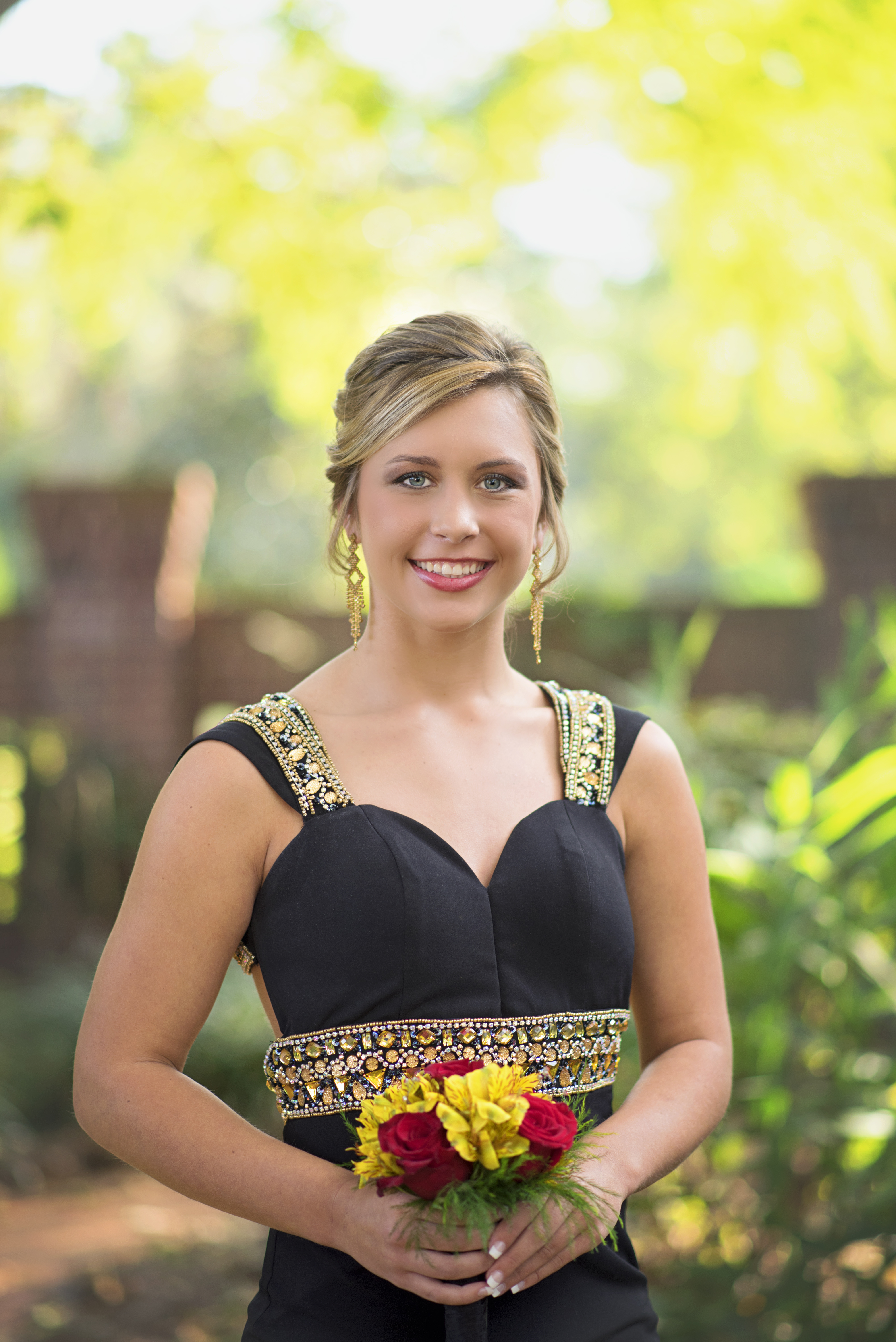 Painting of a smiling teenage girl wearing a dark shirt and heart-shaped necklace, set against a blurred yellow and gold background.