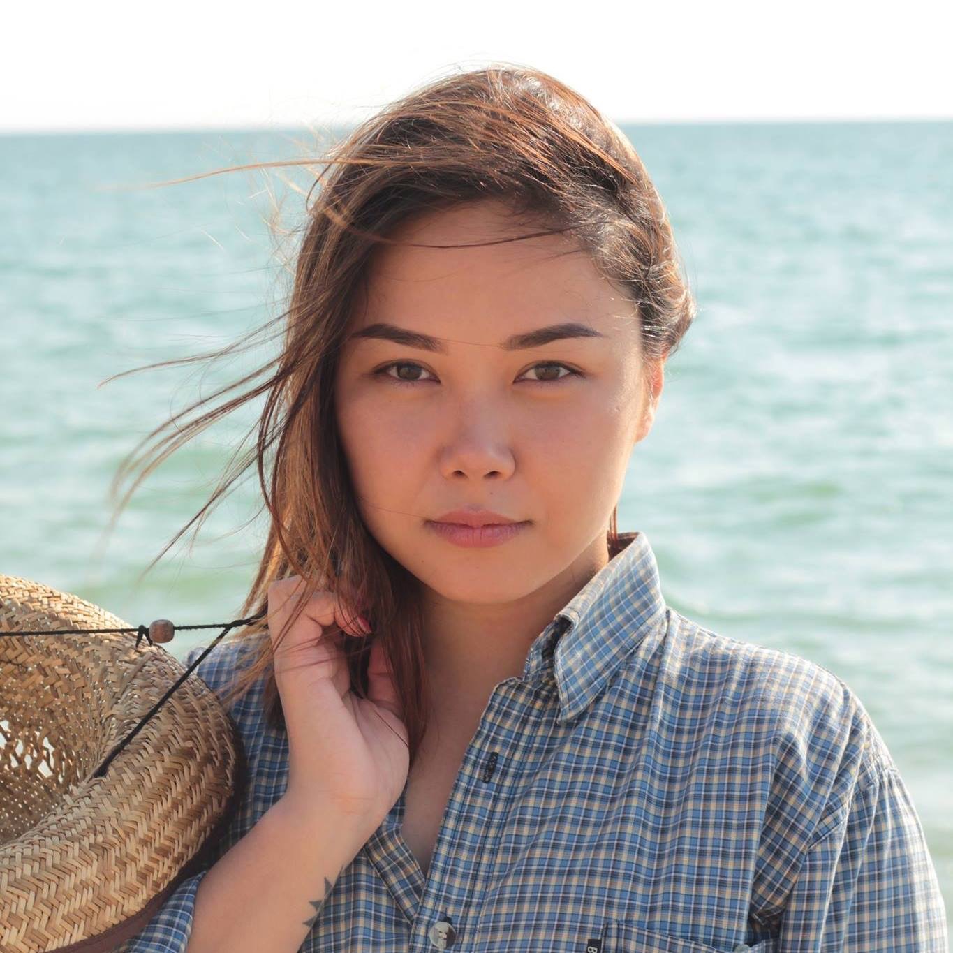 Portrait of a woman with windblown hair, wearing a blue and white checkered shirt and carrying a straw hat, ocean in the background.