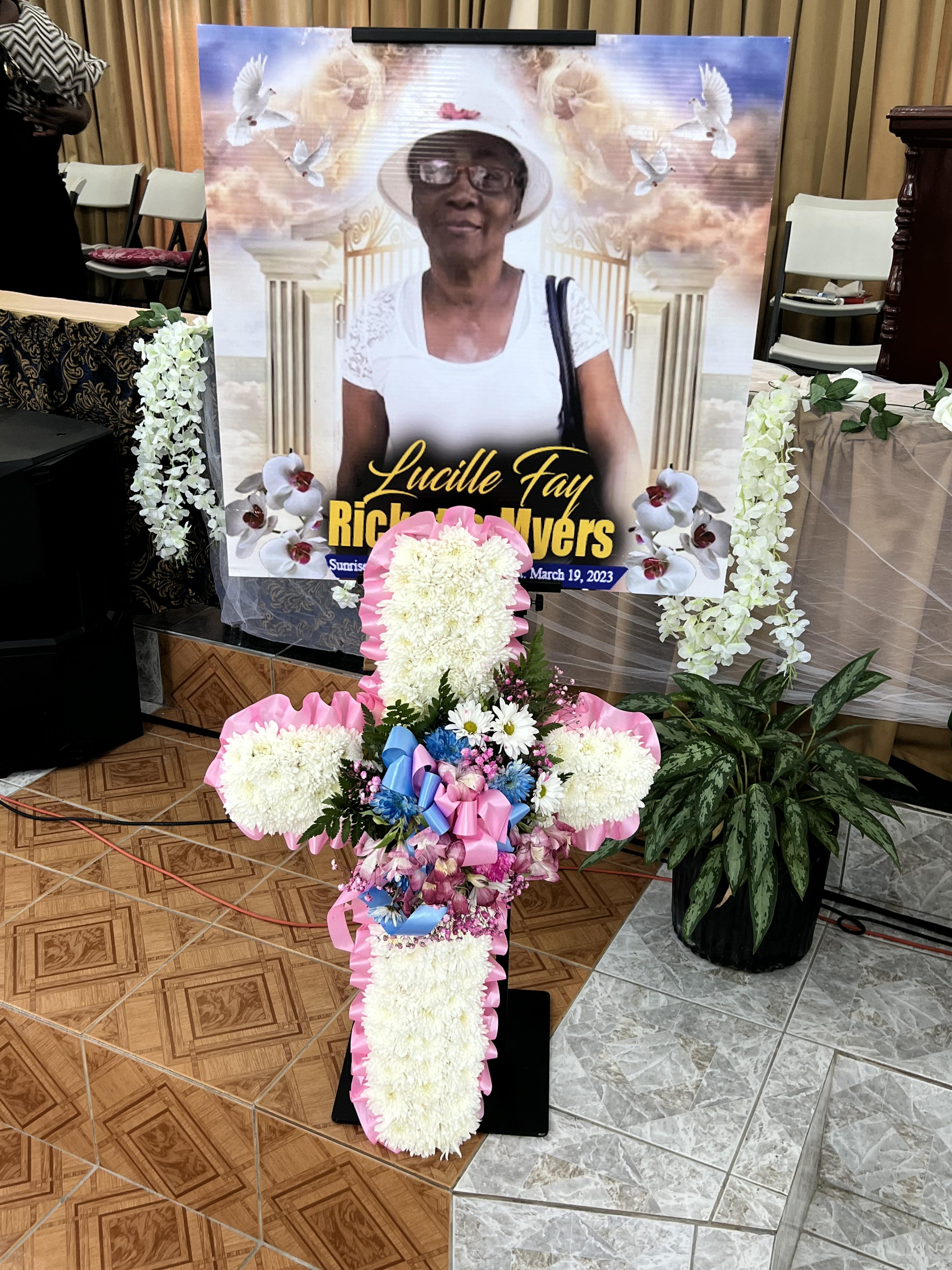 Painting of an elderly woman with wings, wearing a floral gown, text reads, Forever in our heart!