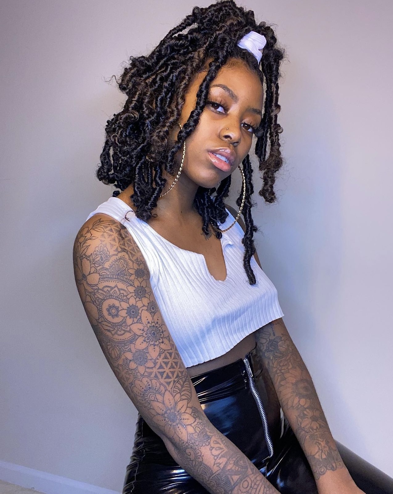 Painting of a young woman with locs, tattoos, and gold hoop earrings.