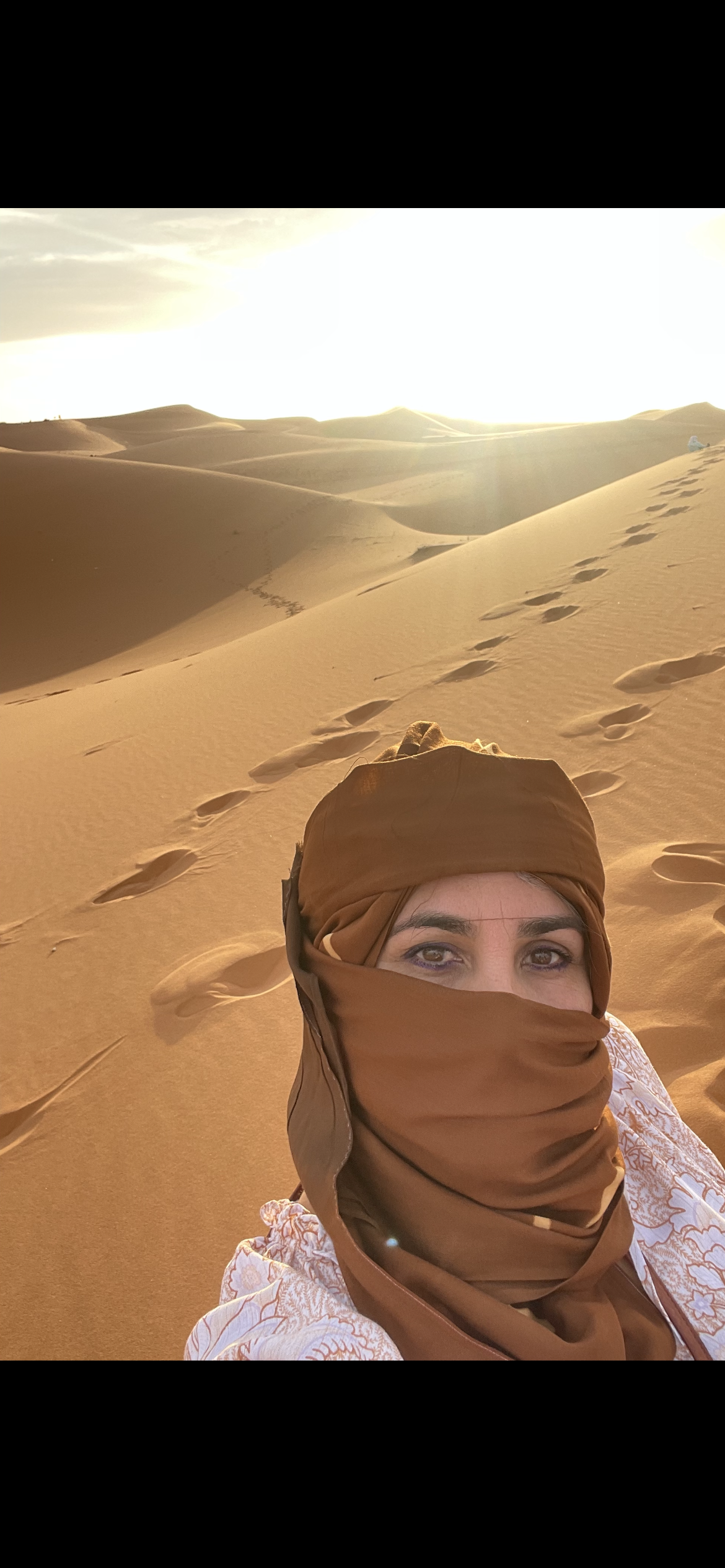 Painting of a woman in a desert, partially veiled, with footprints in the sand.