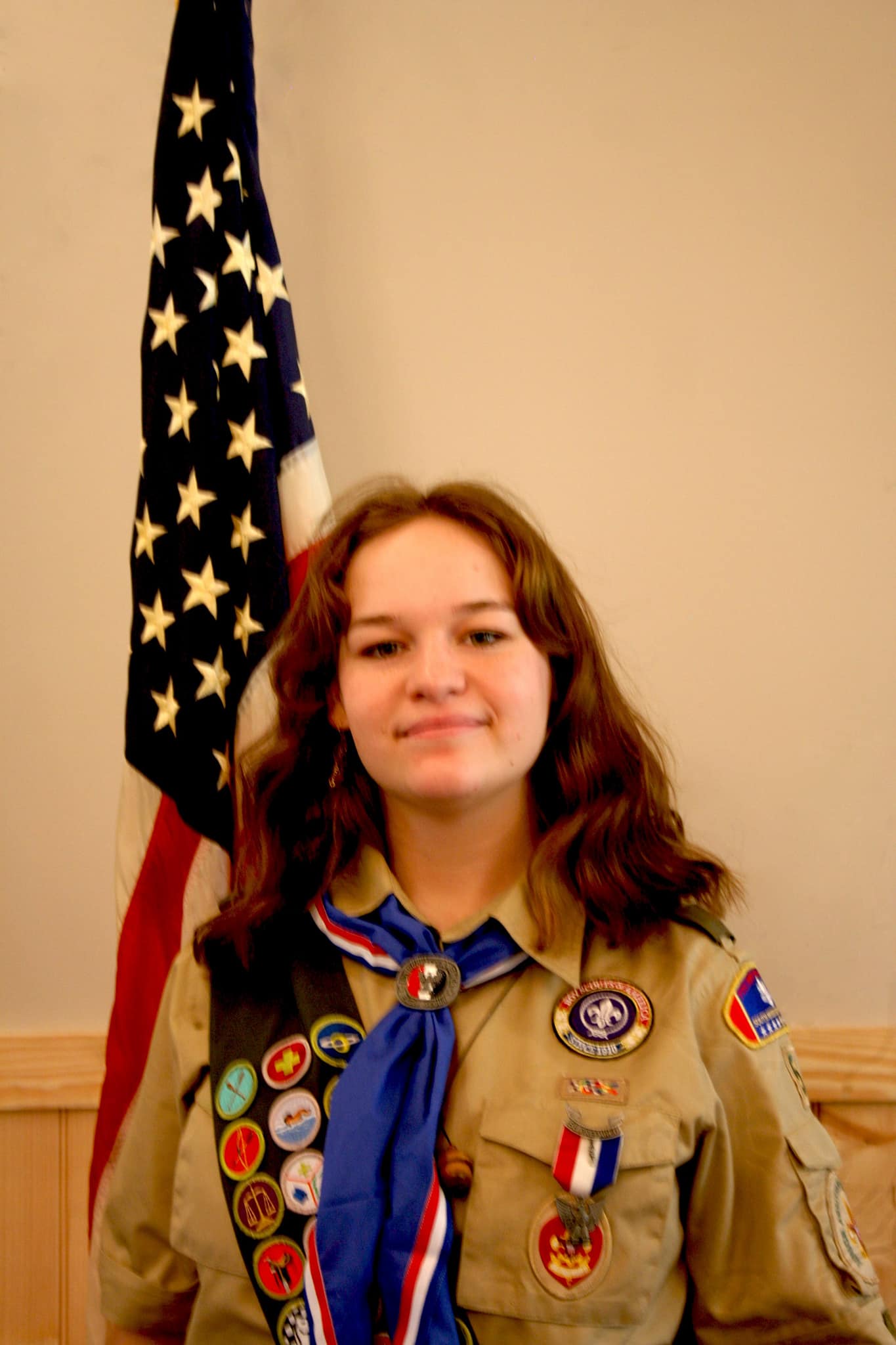 Painting of a young woman in a Girl Scout uniform, standing in front of an American flag.