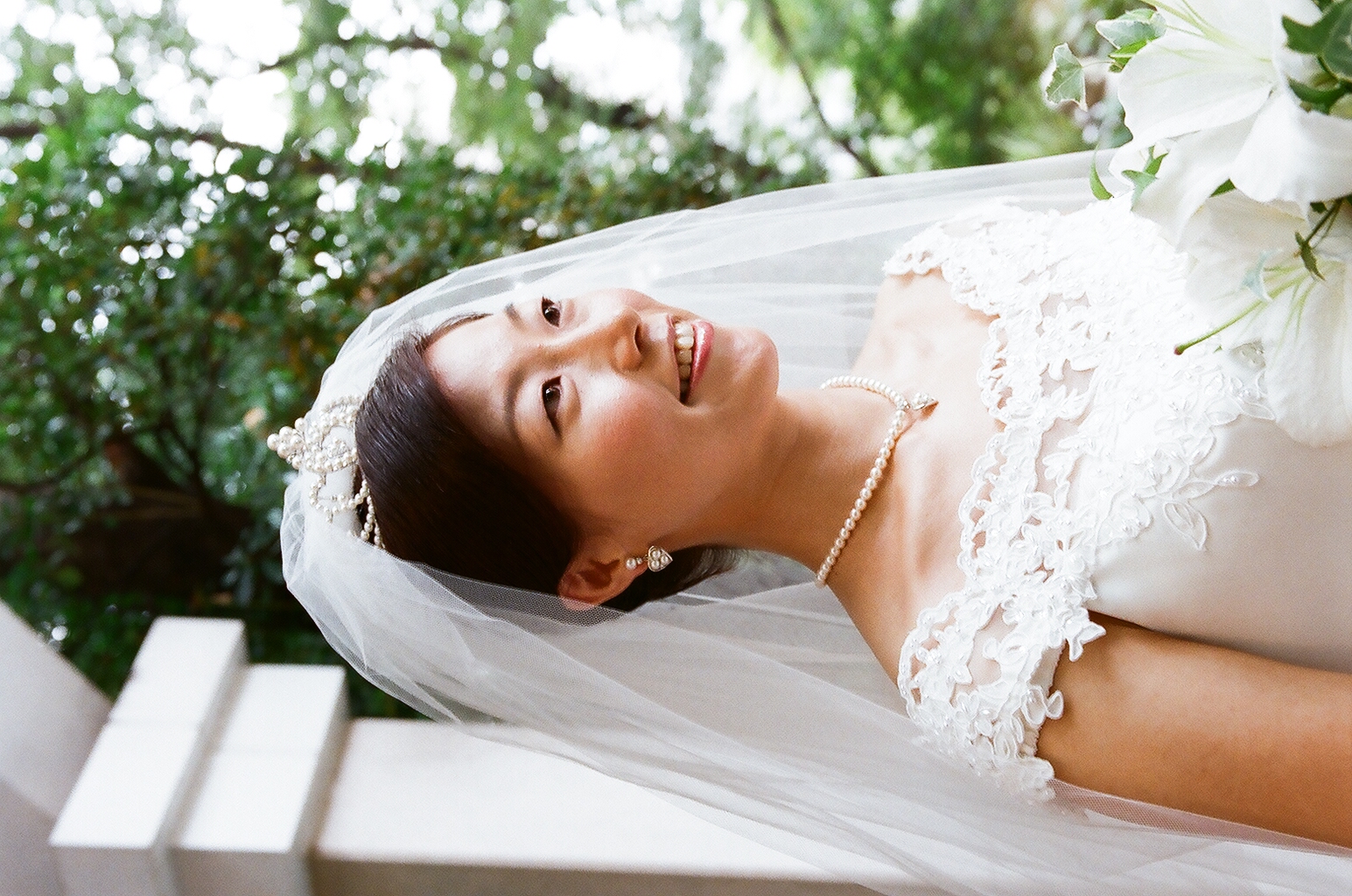 Portrait painting of a smiling bride in a white lace wedding dress and veil.