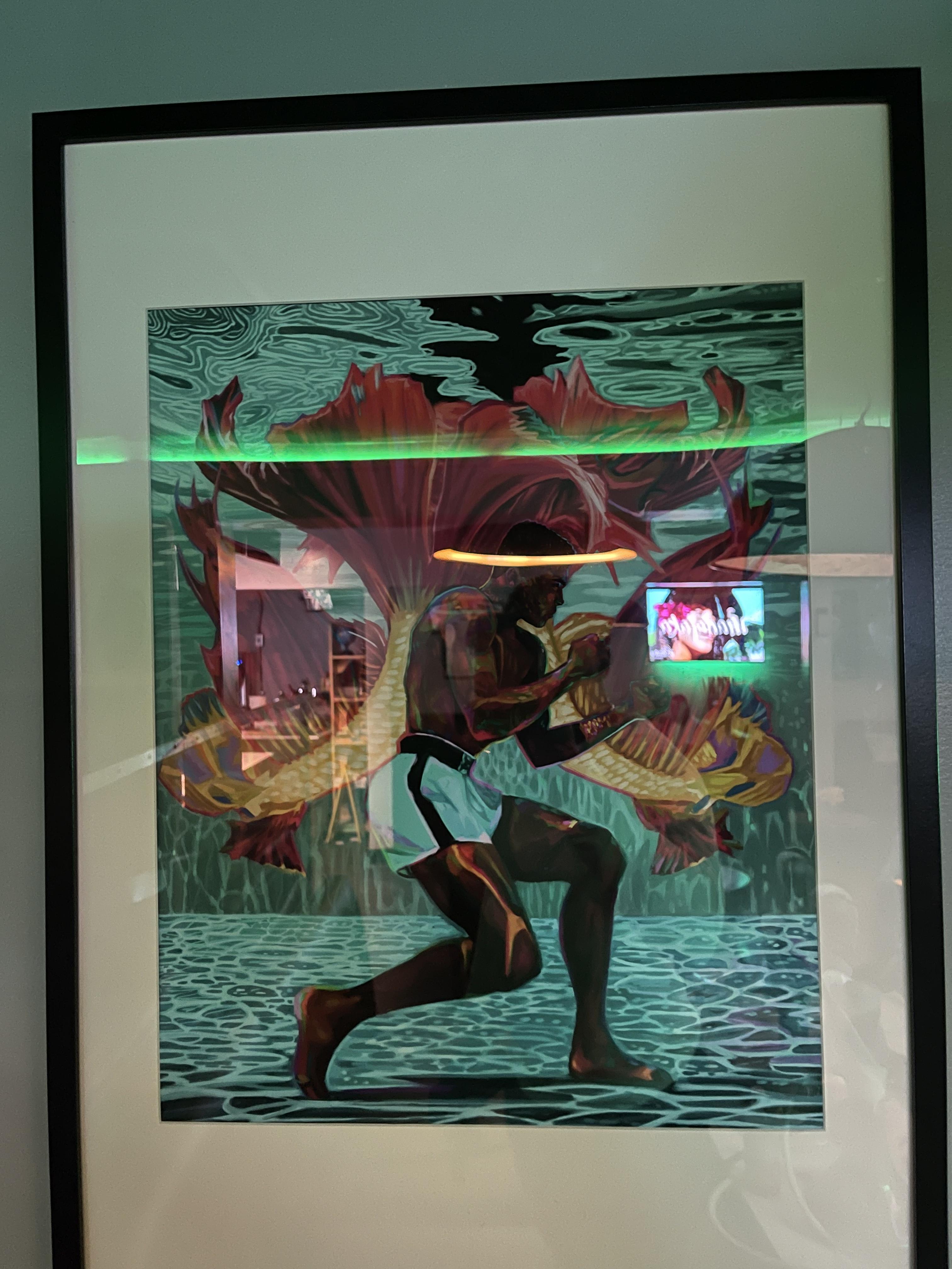 Painting of a boxer amidst a large, red and yellow flower.