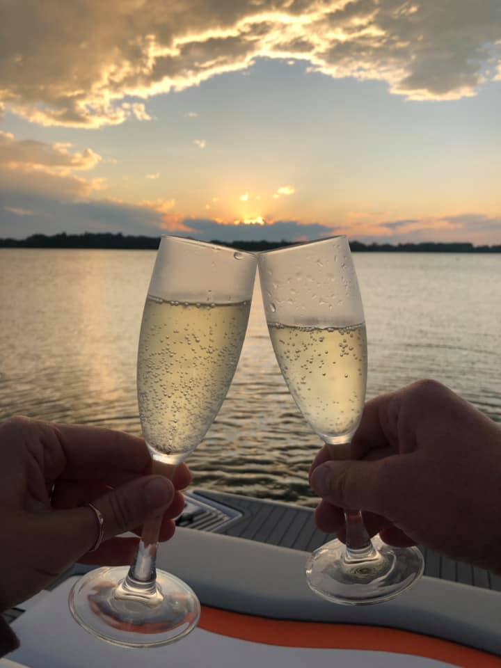 Two champagne flutes etched with 2020 clinking at sunset over water.