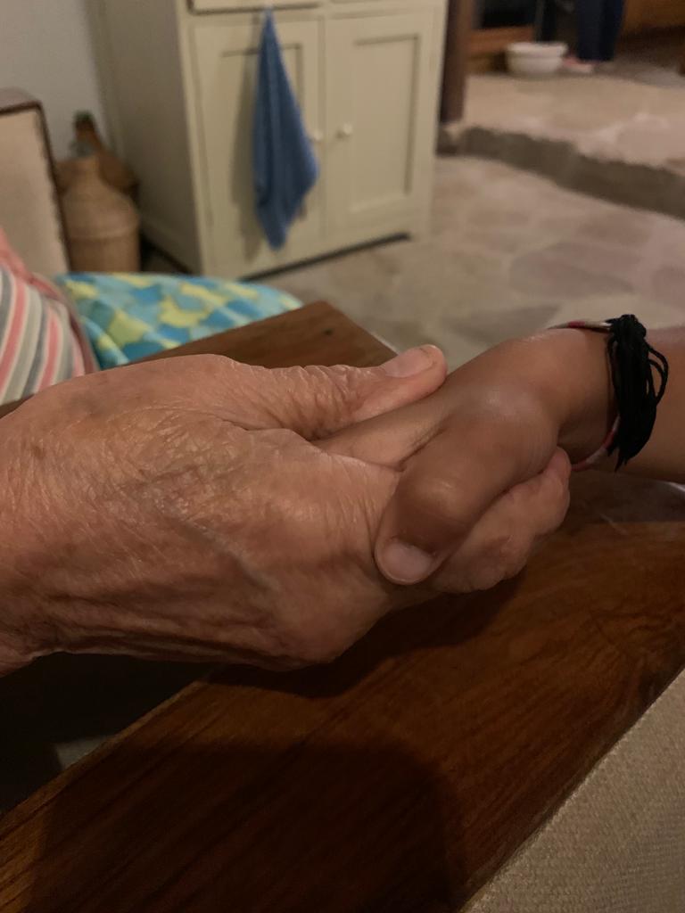 Painting of two hands clasped together, one hand is elderly, the other young.