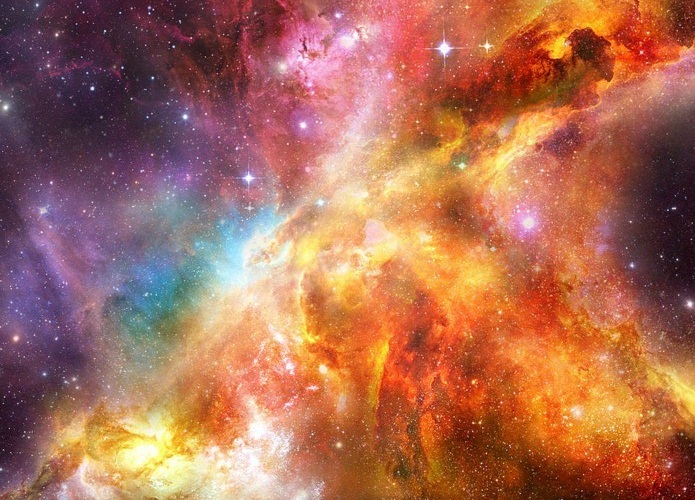 Painting of a nebula with orange, yellow, and purple hues, and scattered stars.