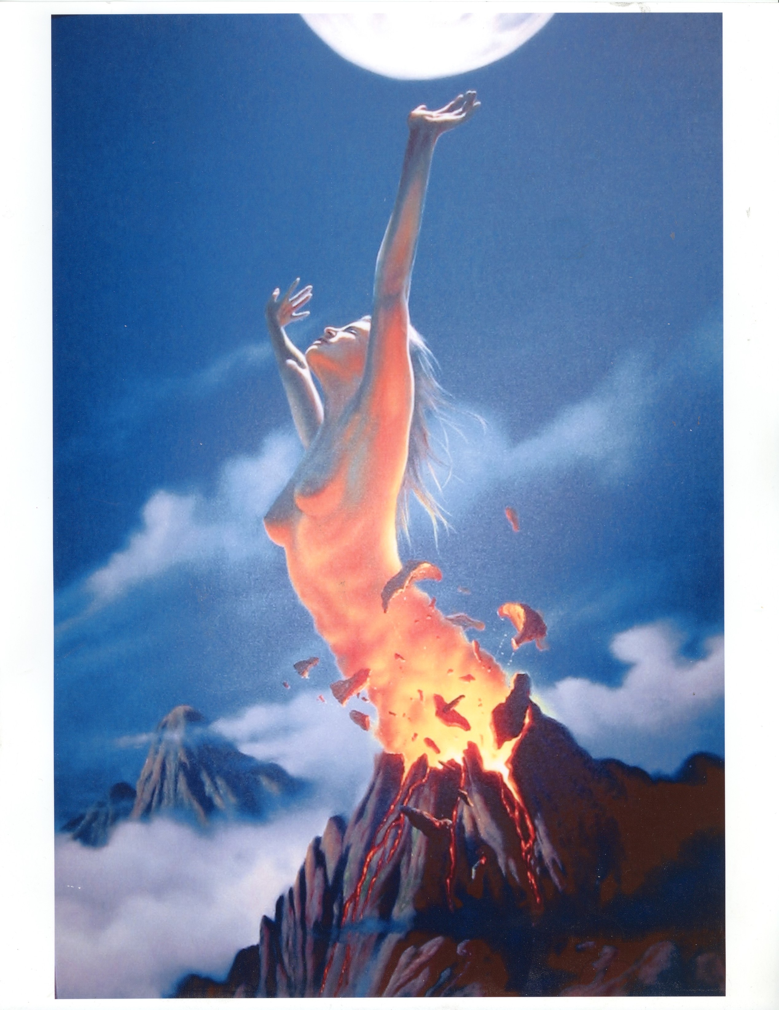 Painting of a nude woman rising from a volcano, arms raised towards a bright moon in a blue sky.