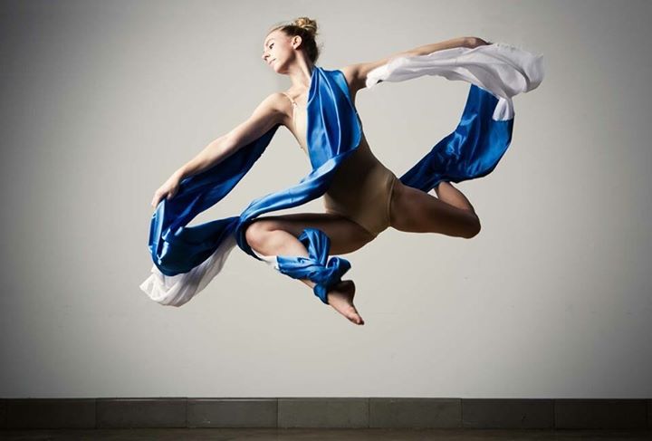 Painting of a dancer in mid-air, draped in flowing blue and white fabric.