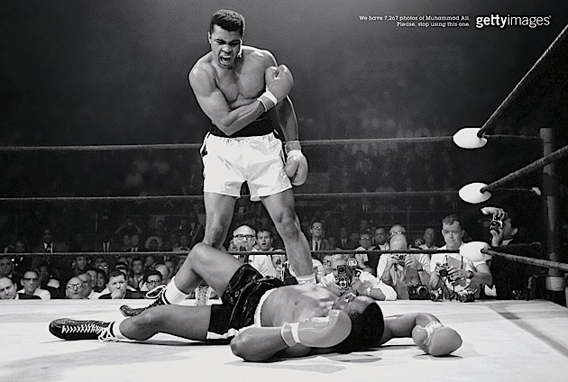 Black and white painting of a victorious Muhammad Ali standing over a fallen opponent in a boxing ring, with spectators in the background.  Play like a champion today. Ringside.