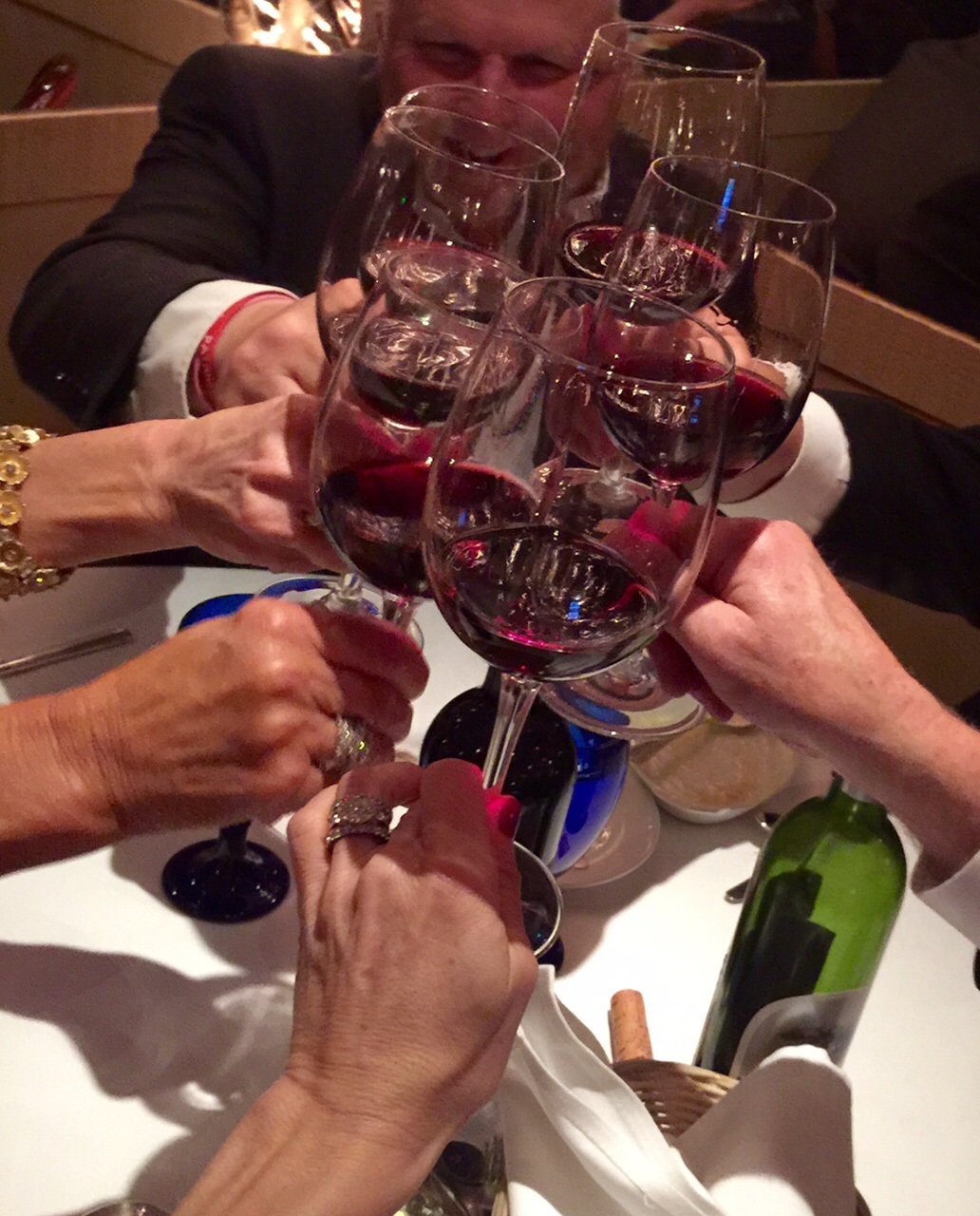 Close-up of several hands raising glasses of red wine in a toast, a man`s face visible behind the glasses.