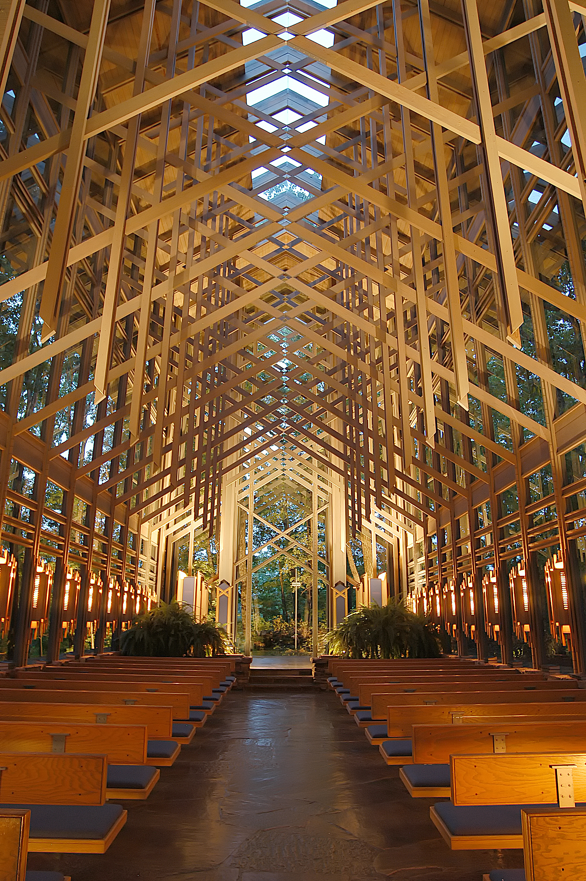 Painting of a wooden chapel interior with rows of pews and a view through the structure to the outdoors.