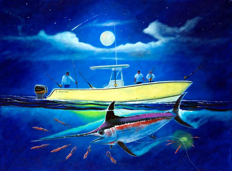 Nighttime fishing scene: a boat with fishermen, a swordfish underwater, and a moonlit sky.