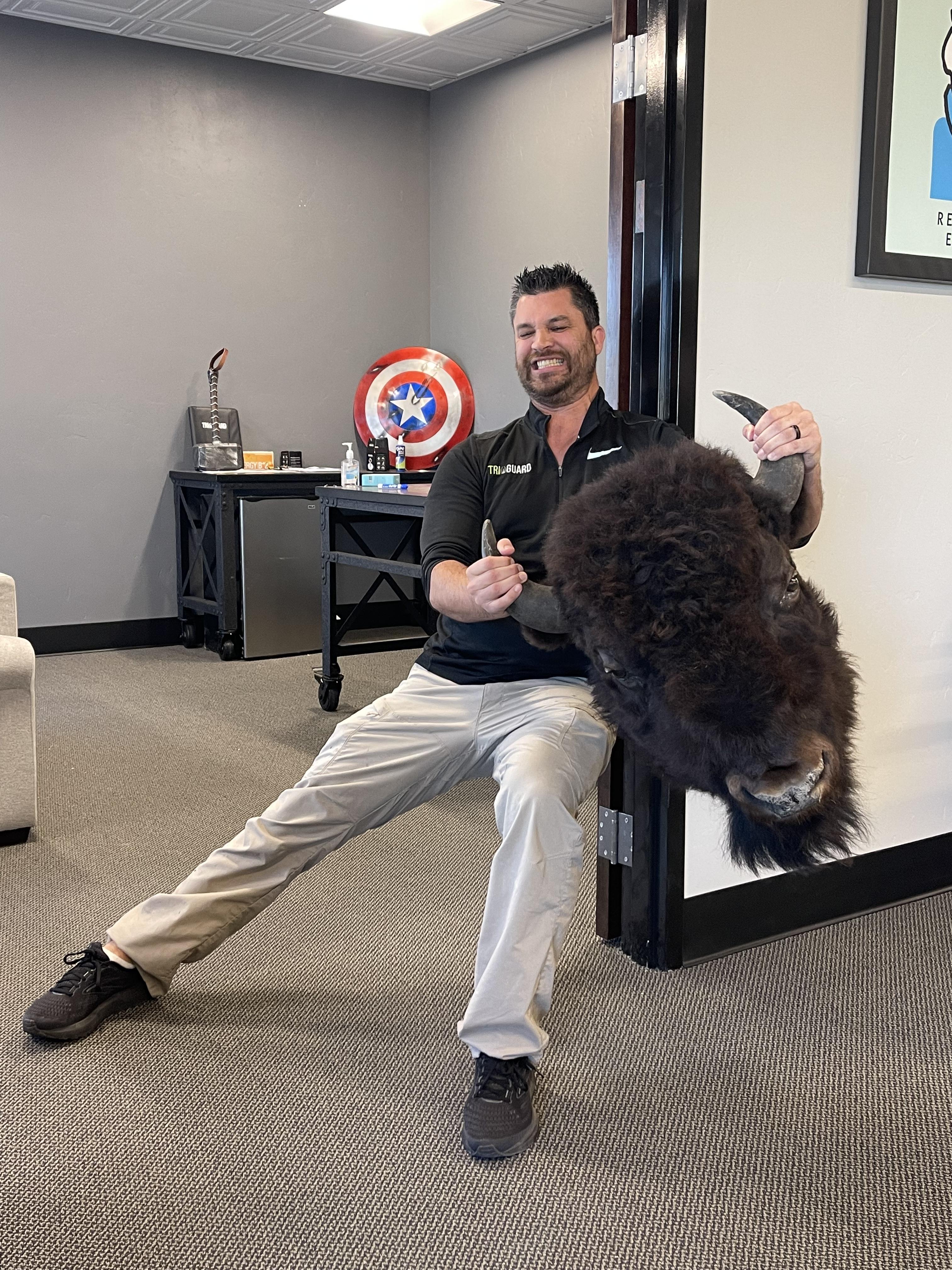 Painting of a muscular man wrestling a large bull.
