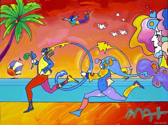 Abstract painting of two figures running, a person parasailing, and stylized flora and fauna.