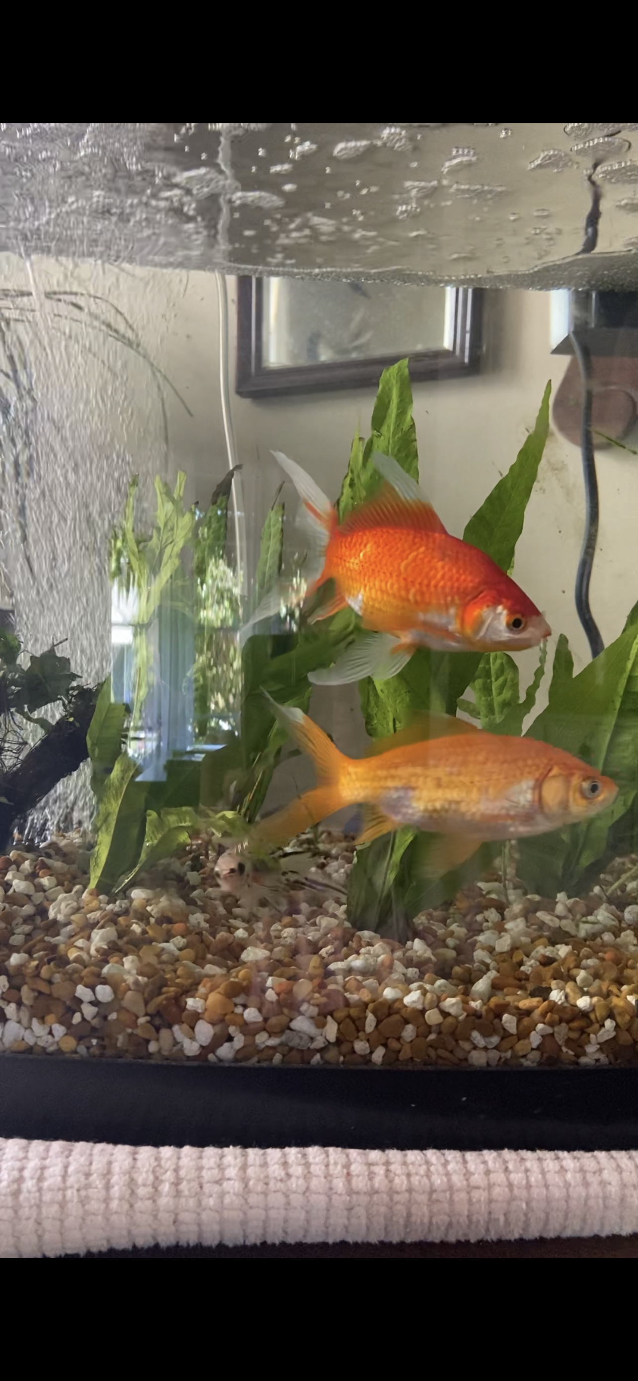 Painting of three goldfish swimming among green plants in an aquarium.