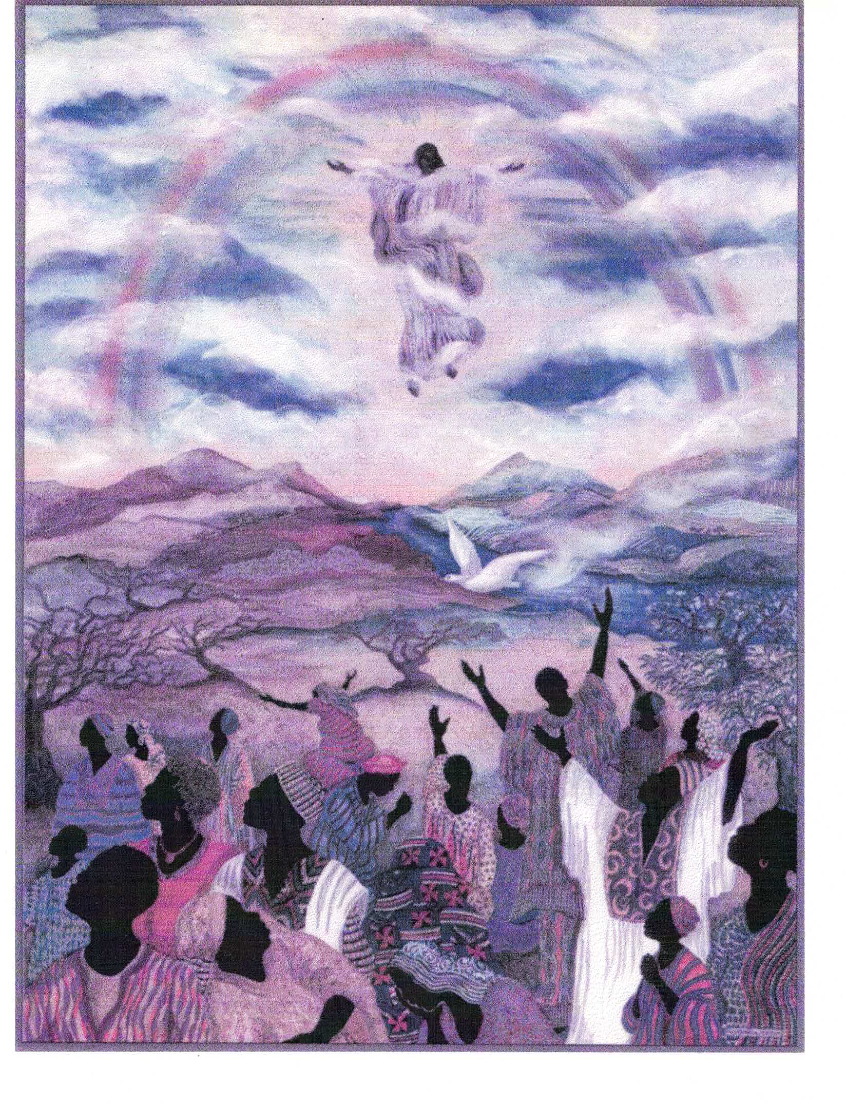 Painting of people worshipping a figure ascending into a cloudy sky with a rainbow, 2 Chronicles 7:14.