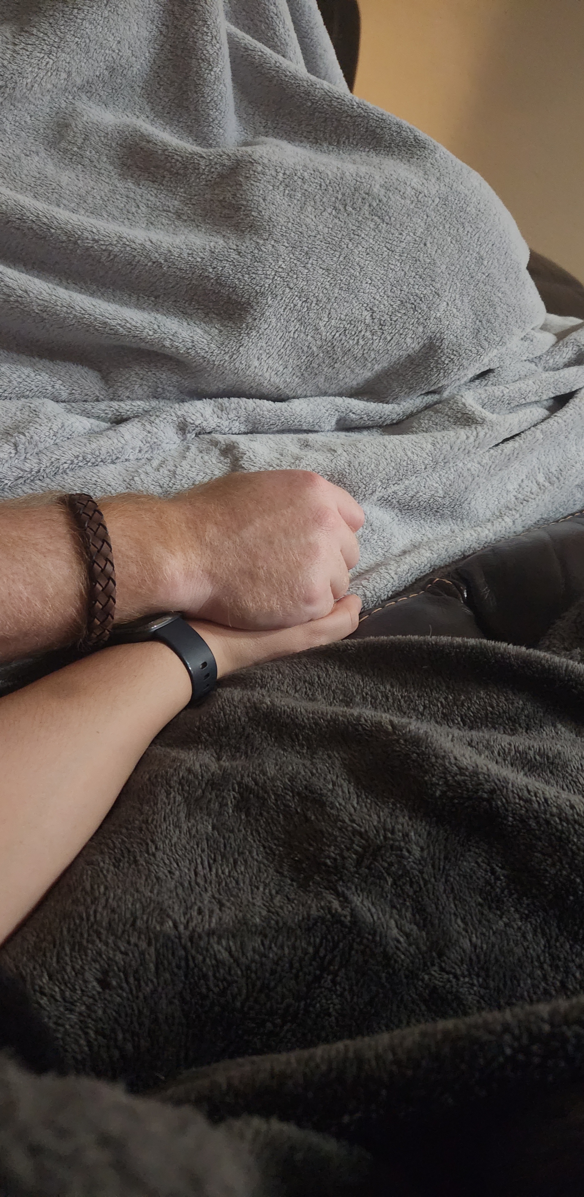 Painting of two hands intertwined, one hand wears a black ring, the other a diamond ring, text reads Just you and me.