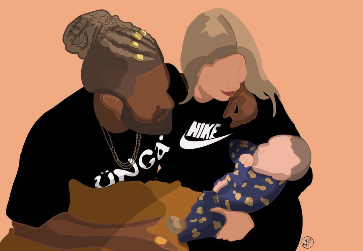 Painting of a family: a man with dreadlocks, a woman with long hair, and a baby.