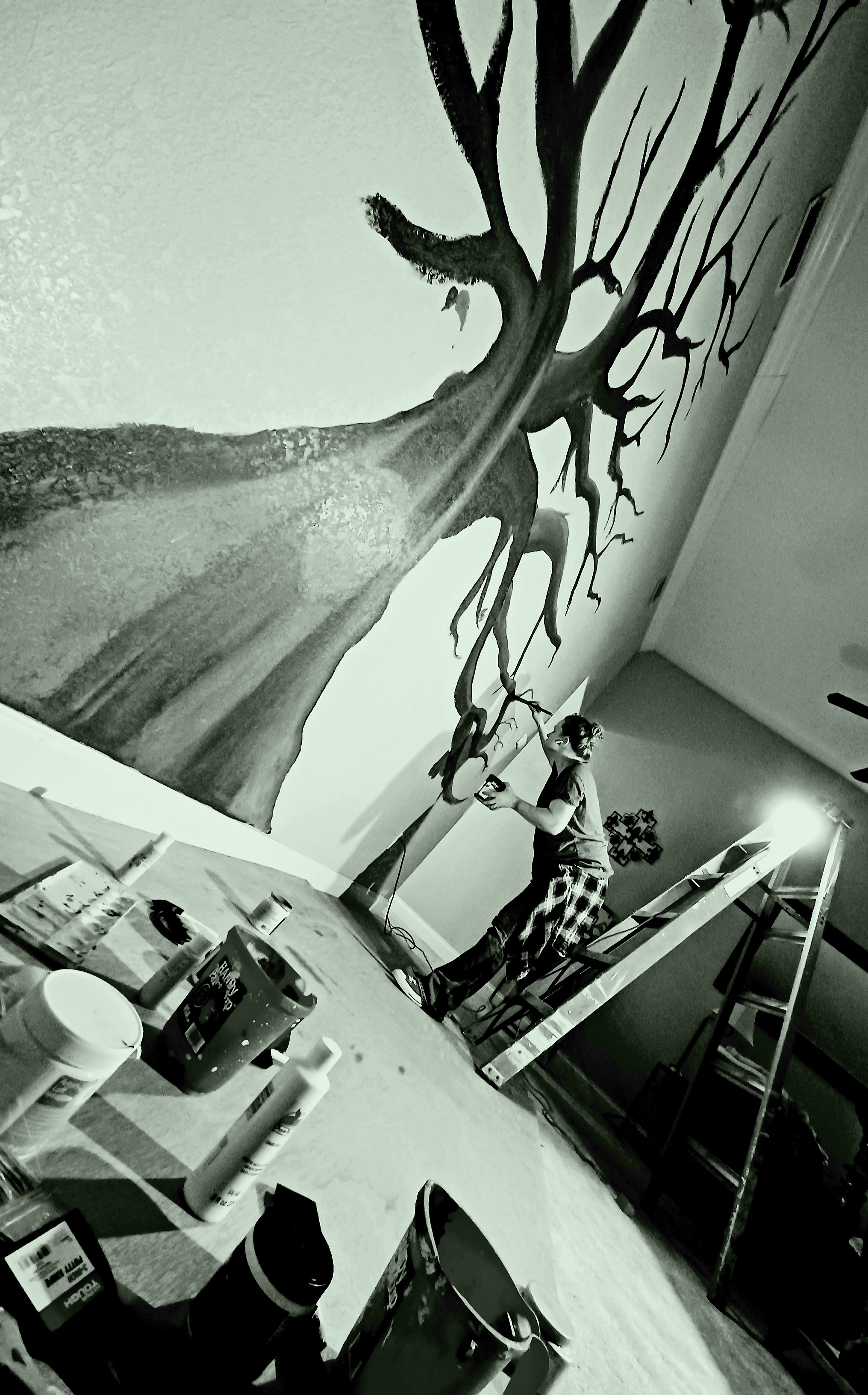 Person painting a large grayscale mural of a tree on a wall.