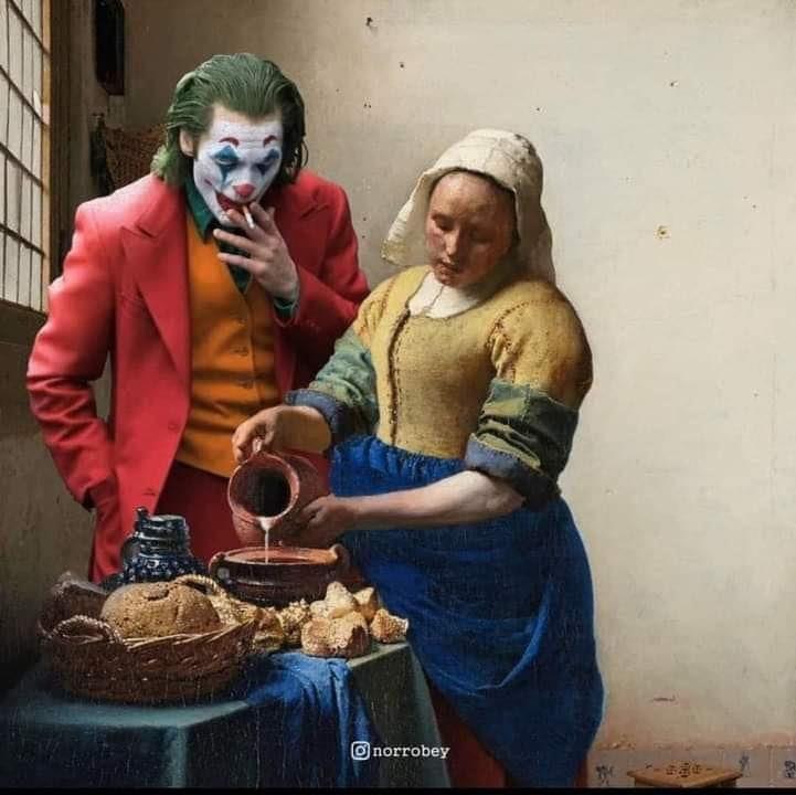 The Joker in a red suit, watching a milkmaid pour milk into a bowl of bread.