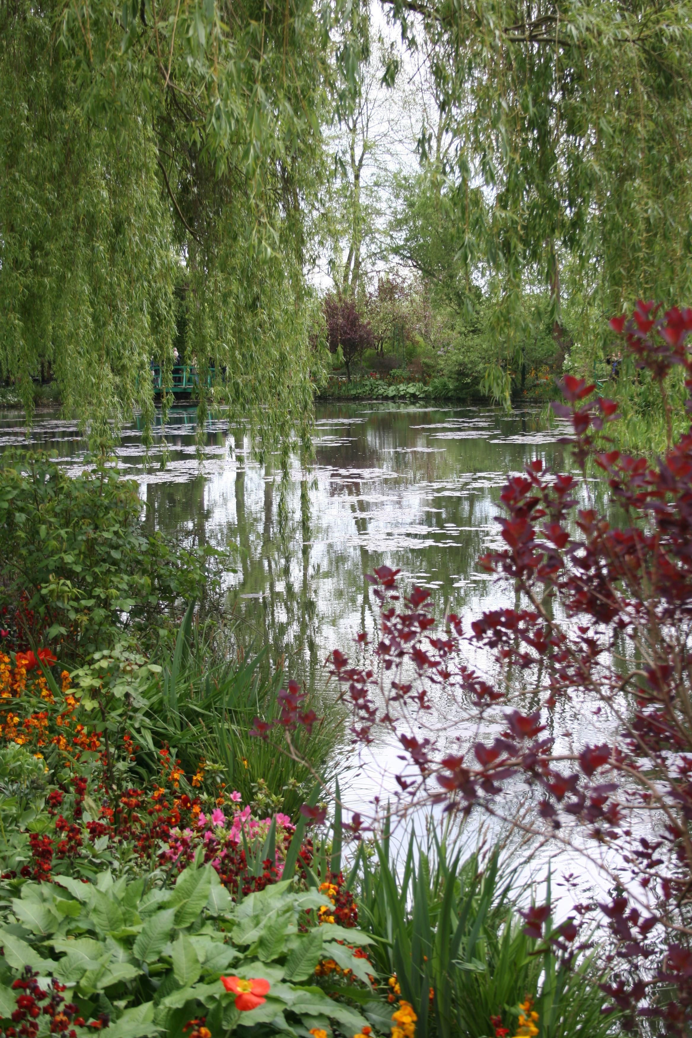 Serene garden scene with pond, weeping willows, bridge, and colorful flowers.