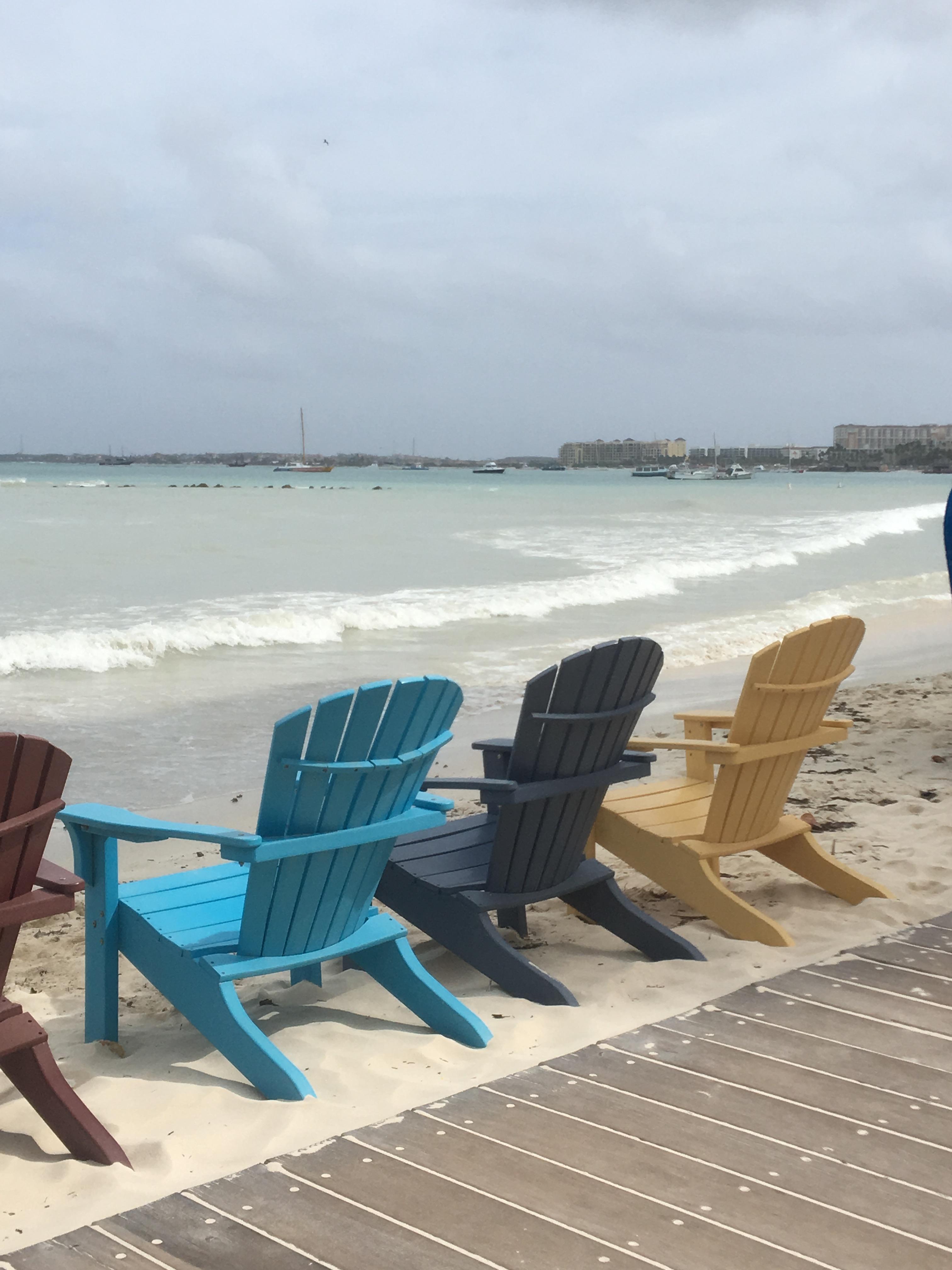 Three Adirondack chairs on a beach facing the ocean.
