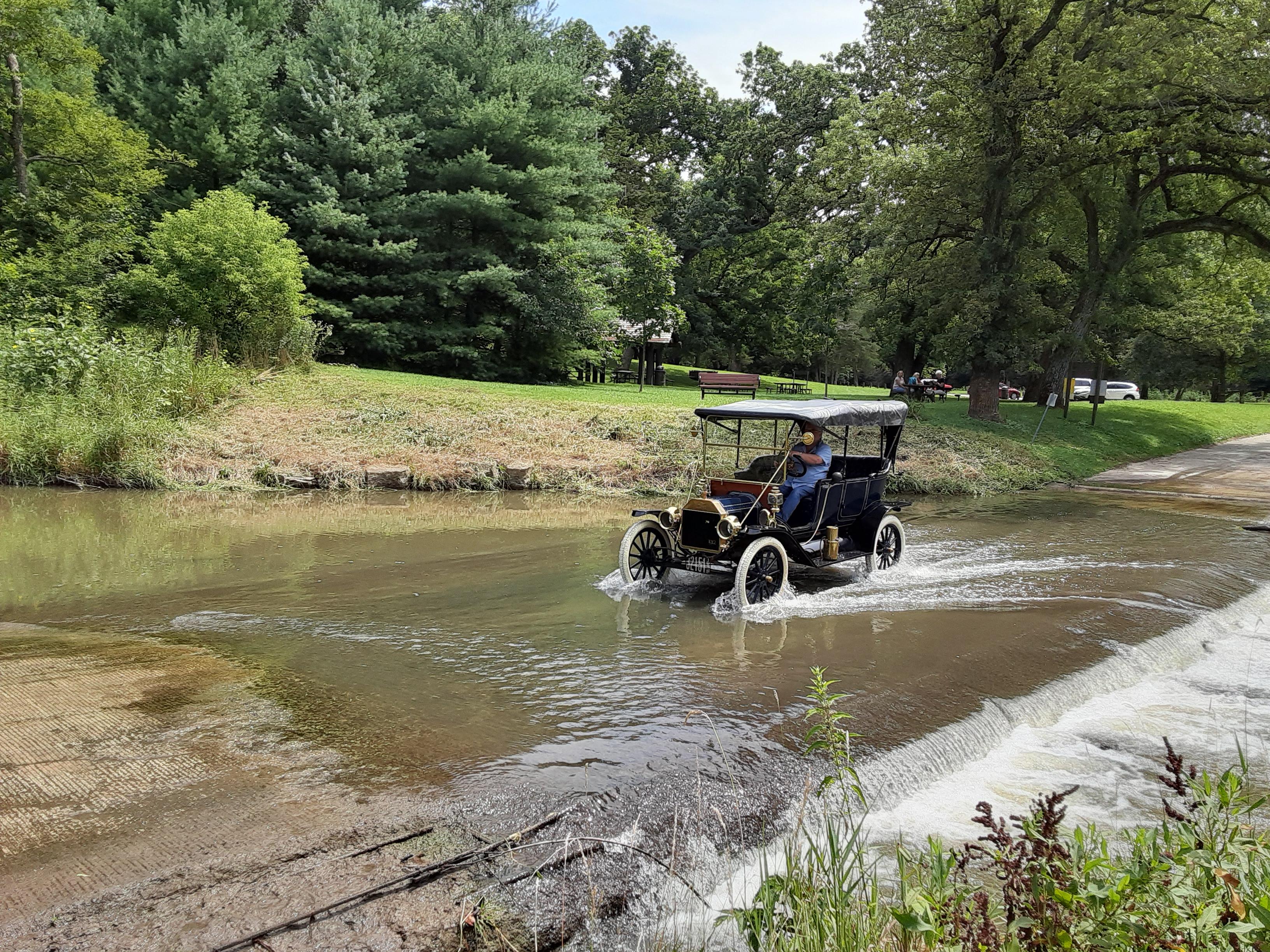 Painting of a Model T Ford driving through a shallow stream in a park.