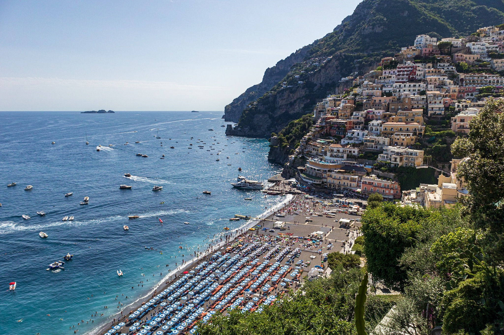Coastal town on a hillside overlooking a crowded beach with numerous boats at sea.