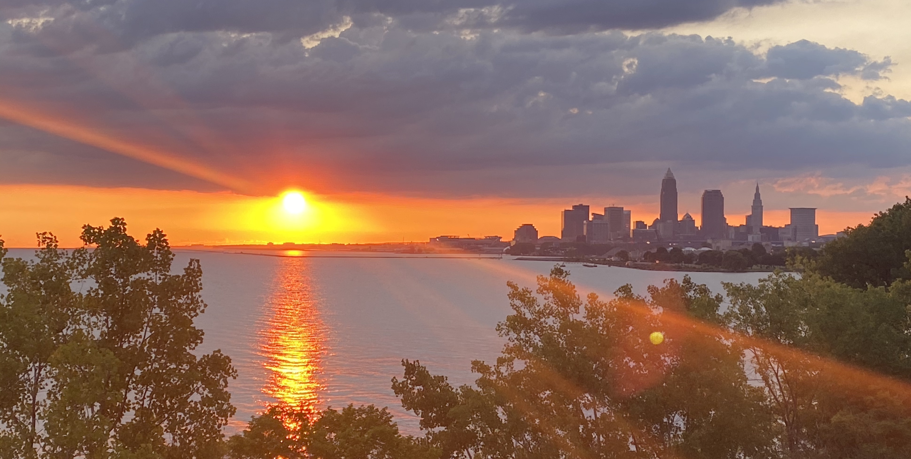 Sunset over city skyline reflected in water.