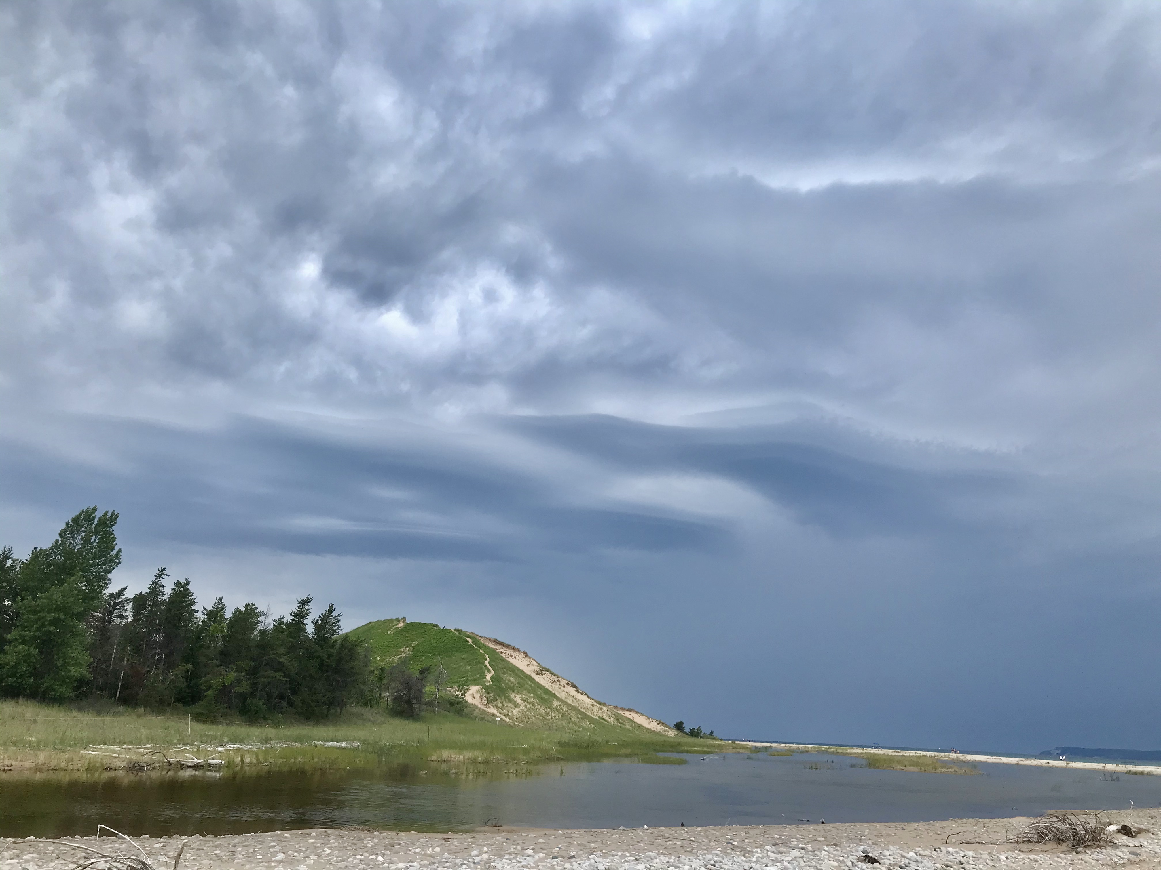Beach scene with waves lapping the shore under a cloudy sky.