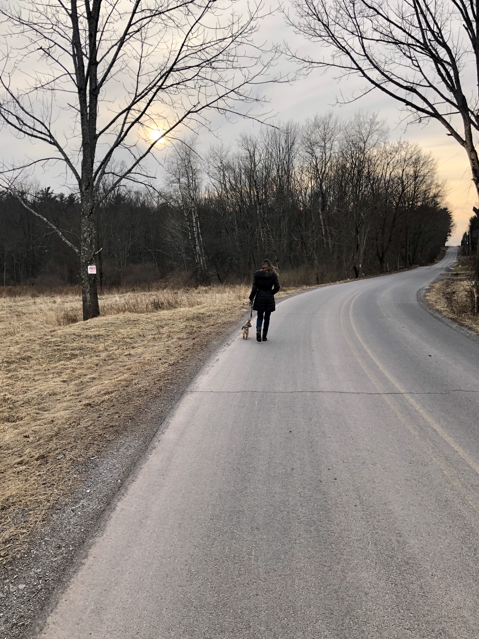 Woman and small dog walking down a curving road at sunset.