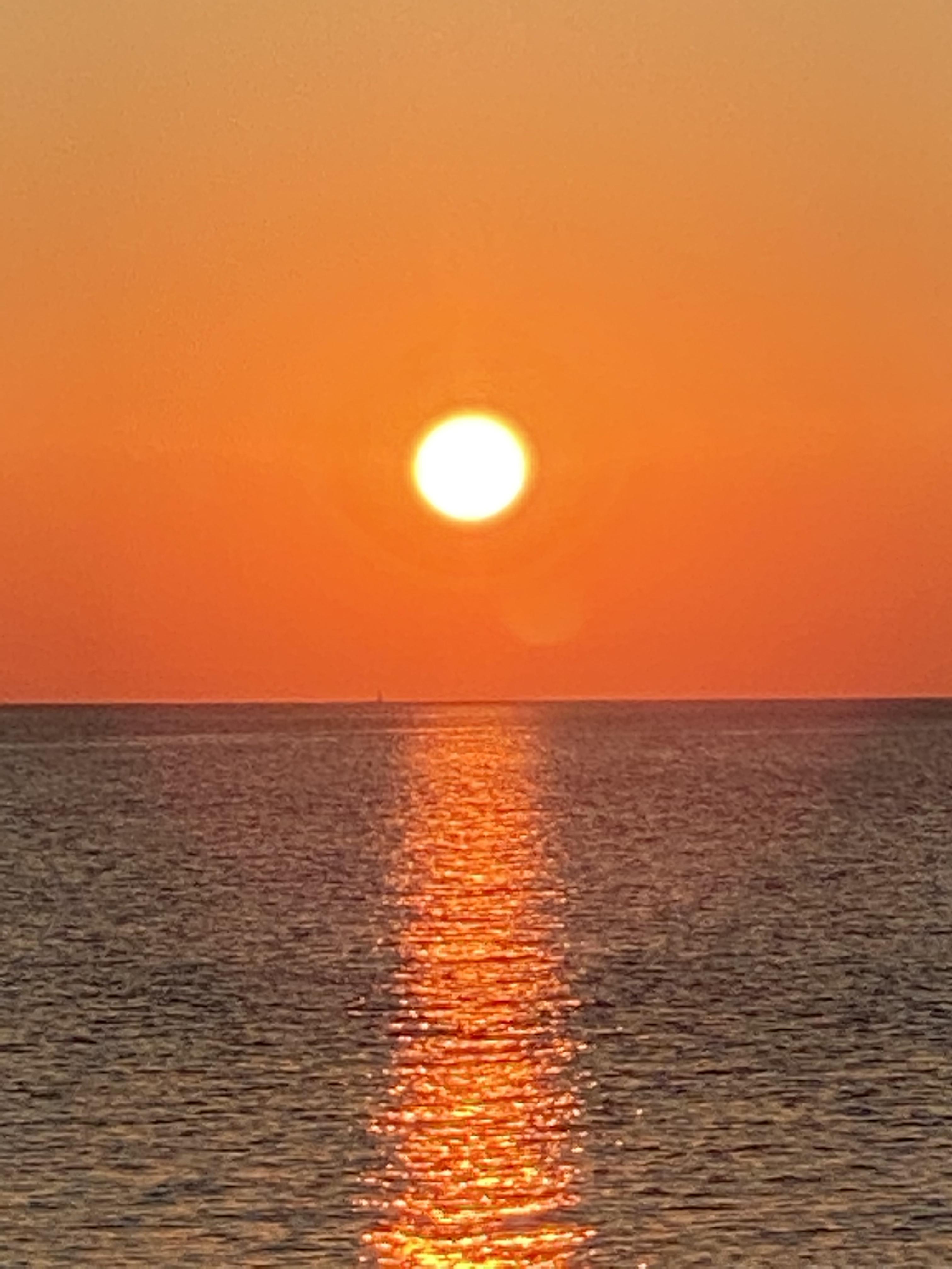 Sunset over calm water with sailboat on horizon.