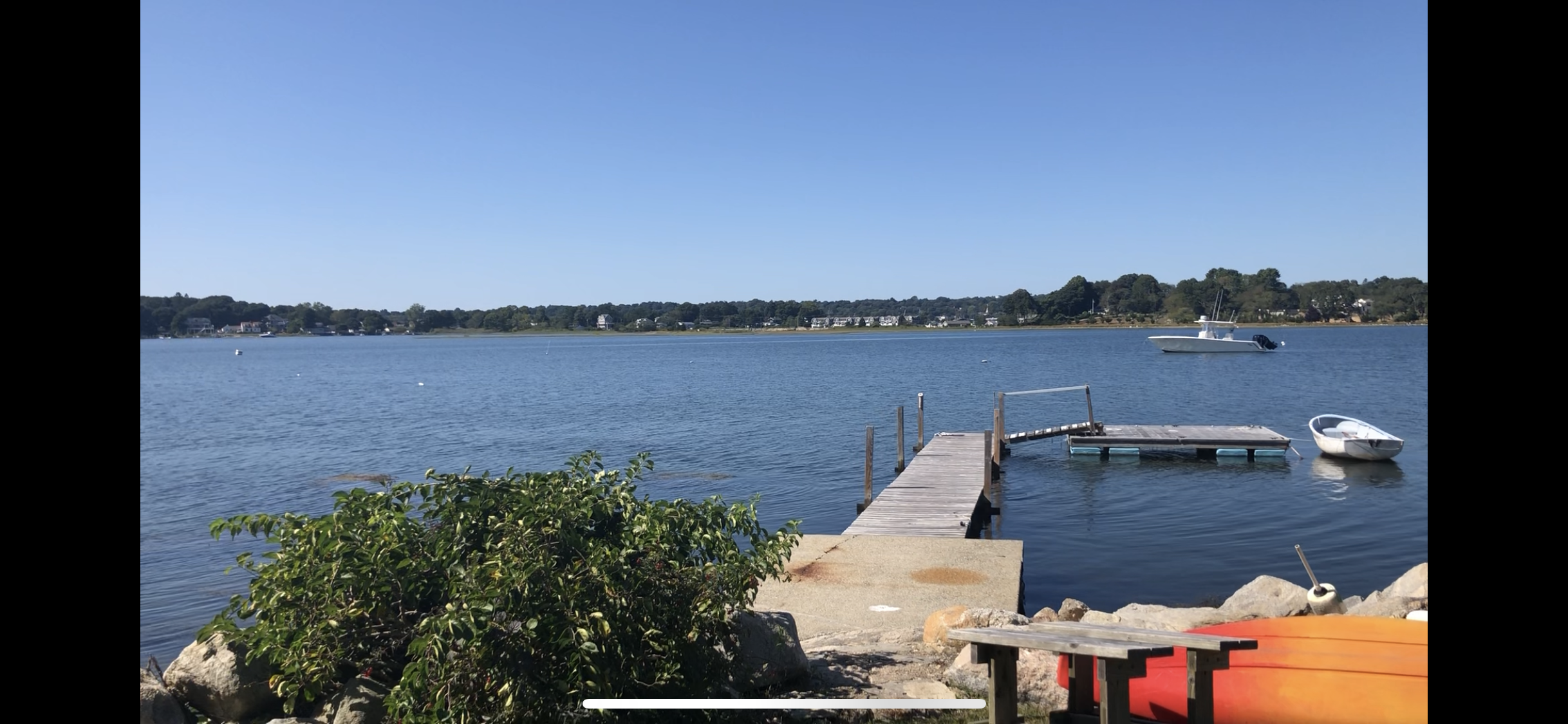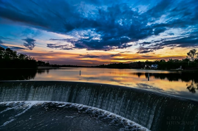 Sunset over calm water, boats at a dock, grassy area with rocks.