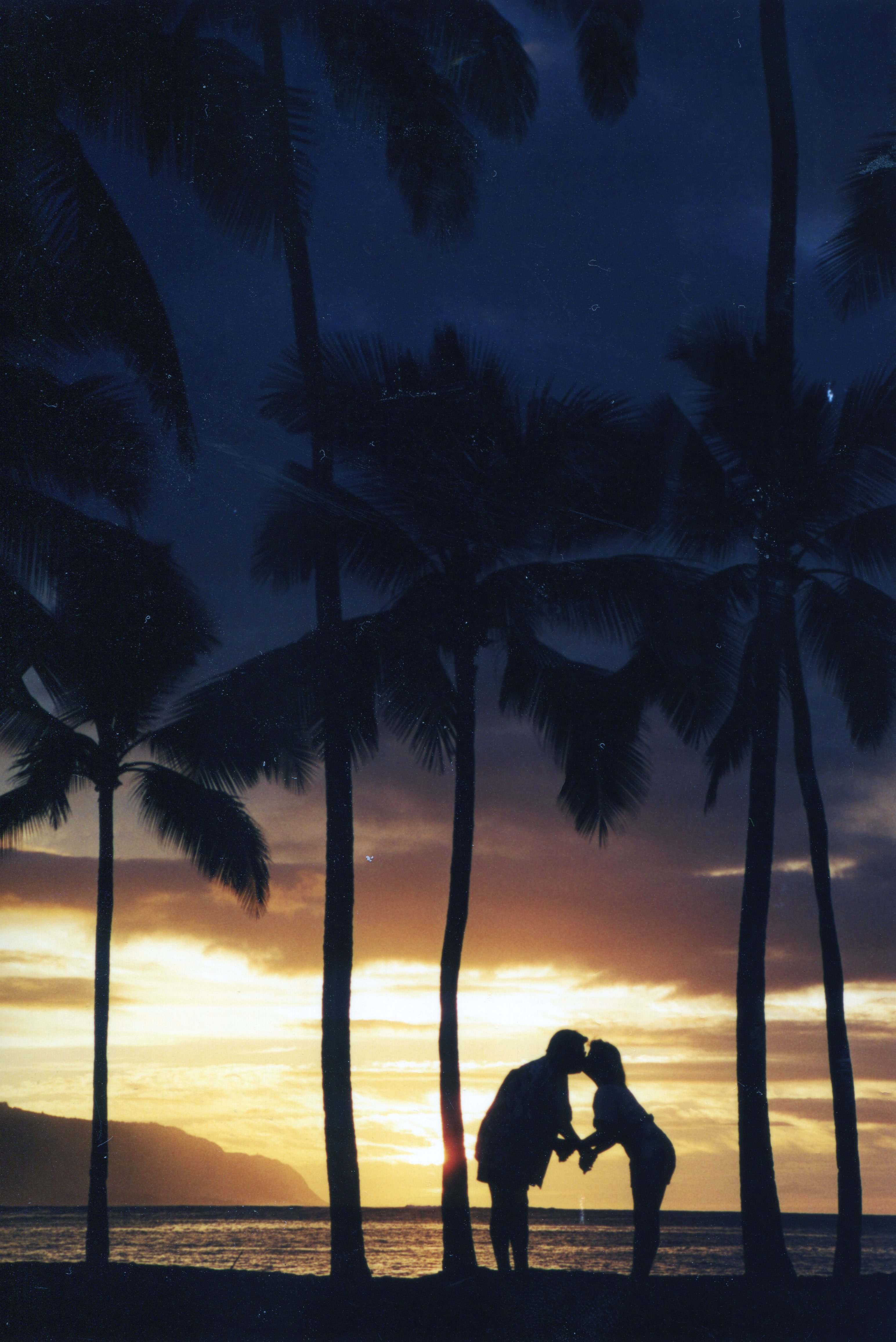 Silhouette of couple kissing at sunset, framed by palm trees.