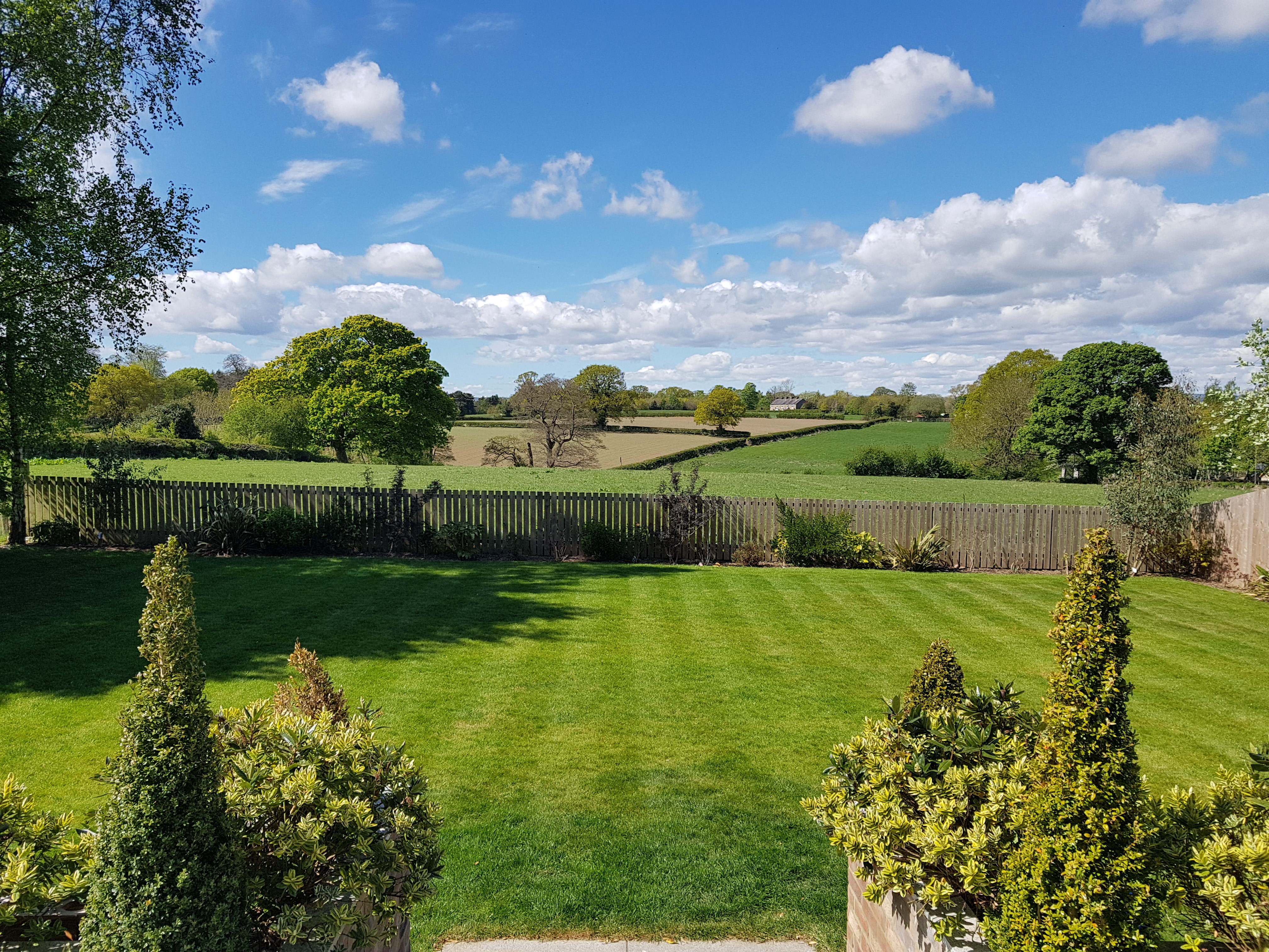 Sunny landscape painting of a green lawn, wooden fence, and rolling hills under a blue sky.