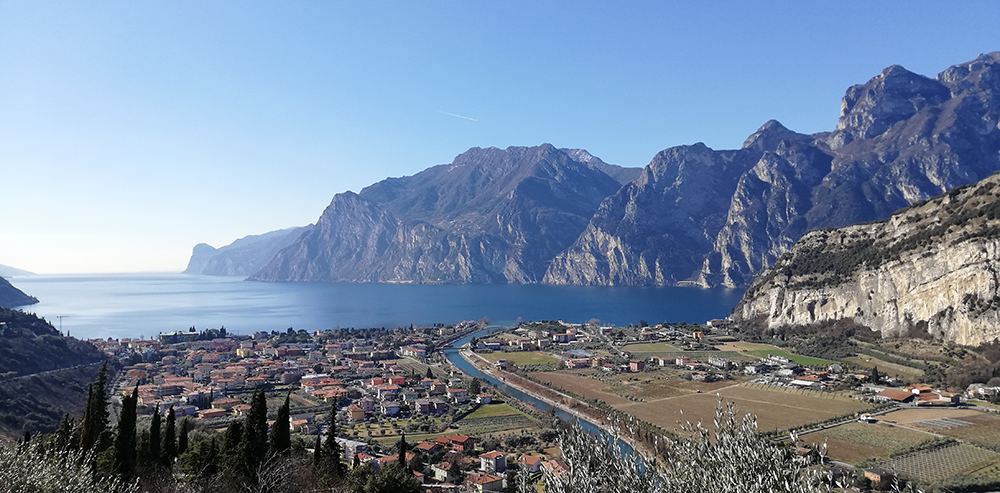 Lake and village landscape painting, mountains in background.